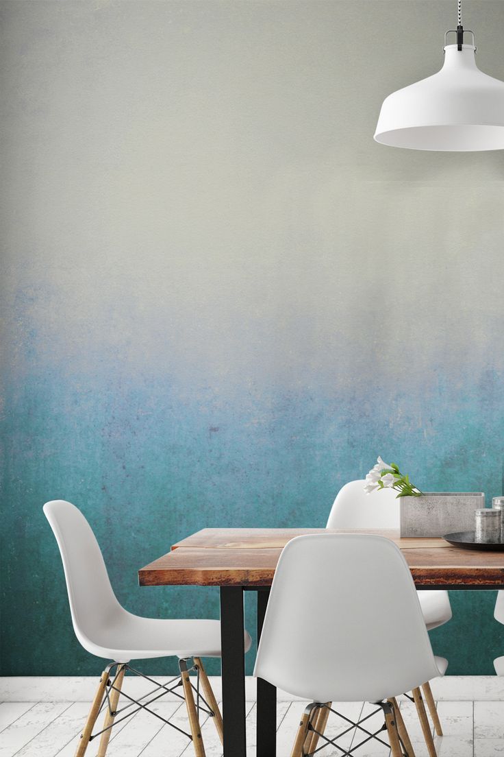Description: A dining room table with white chairs and a blue wall behind it with a white lamp hanging over it.