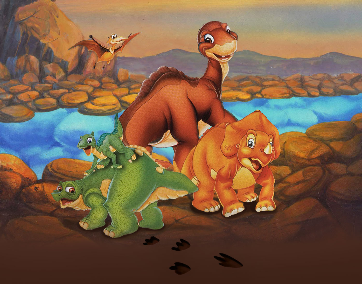Description: A painting of a group of dinosaurs in a rocky area with a river in the background and a mountain in the background.
