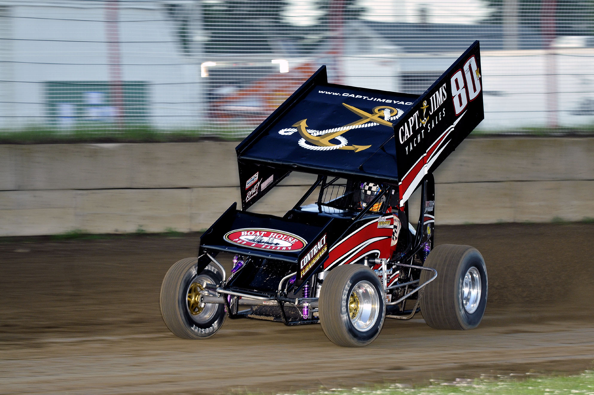 Description: A dirt bike with a flag on the back of it's head and wheels on a dirt track.