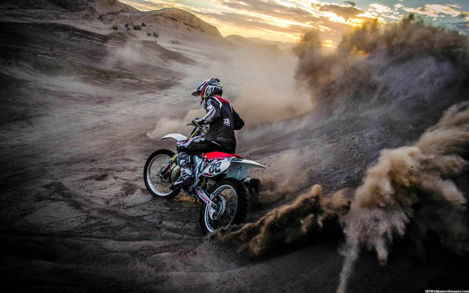 Description: A person riding a dirt bike on a dirt track in the mountains at sunset or sunrise with dust blowing up the ground.