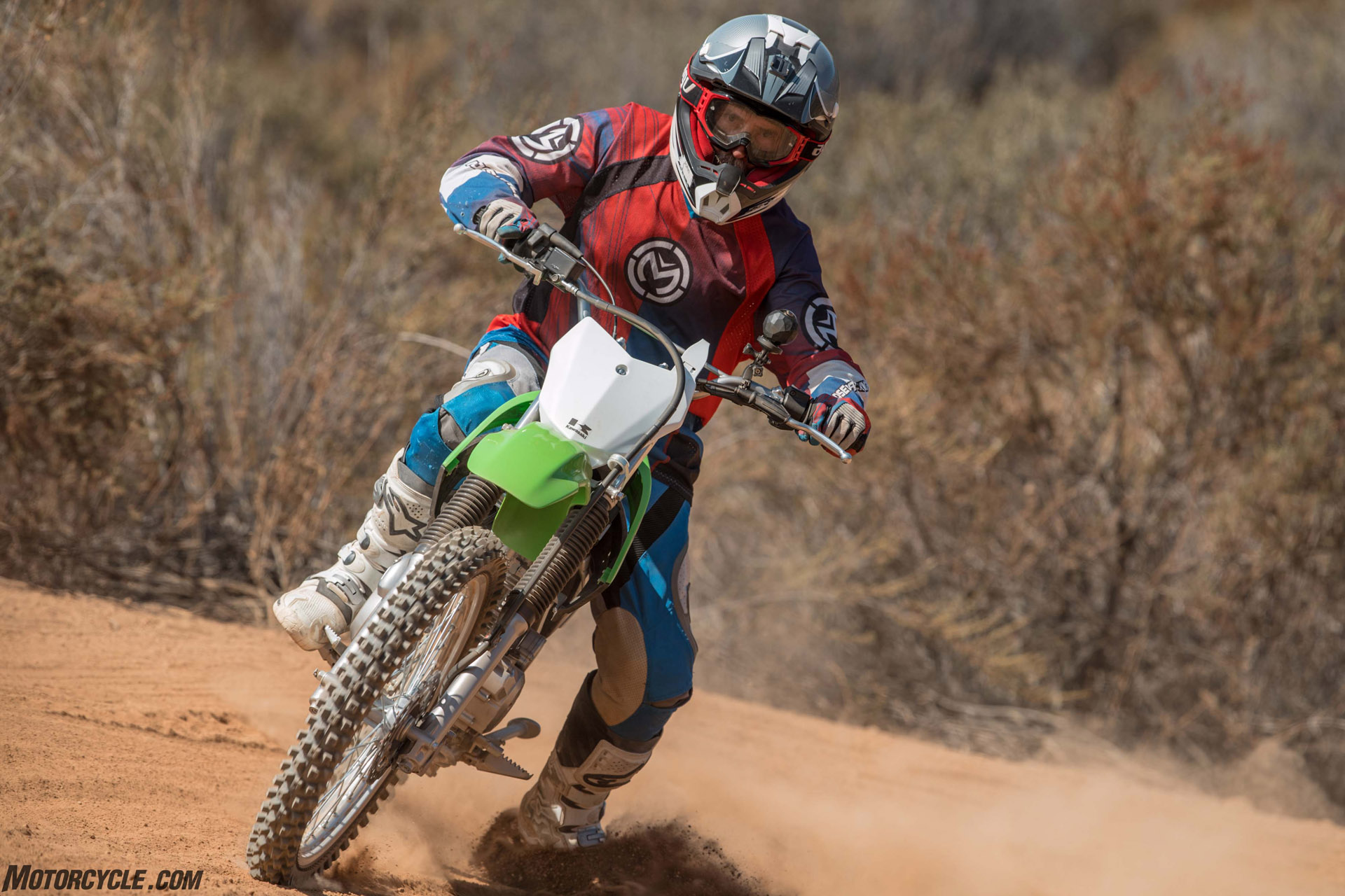 Description: A man riding a dirt bike on a dirt road near bushes and trees in the background.