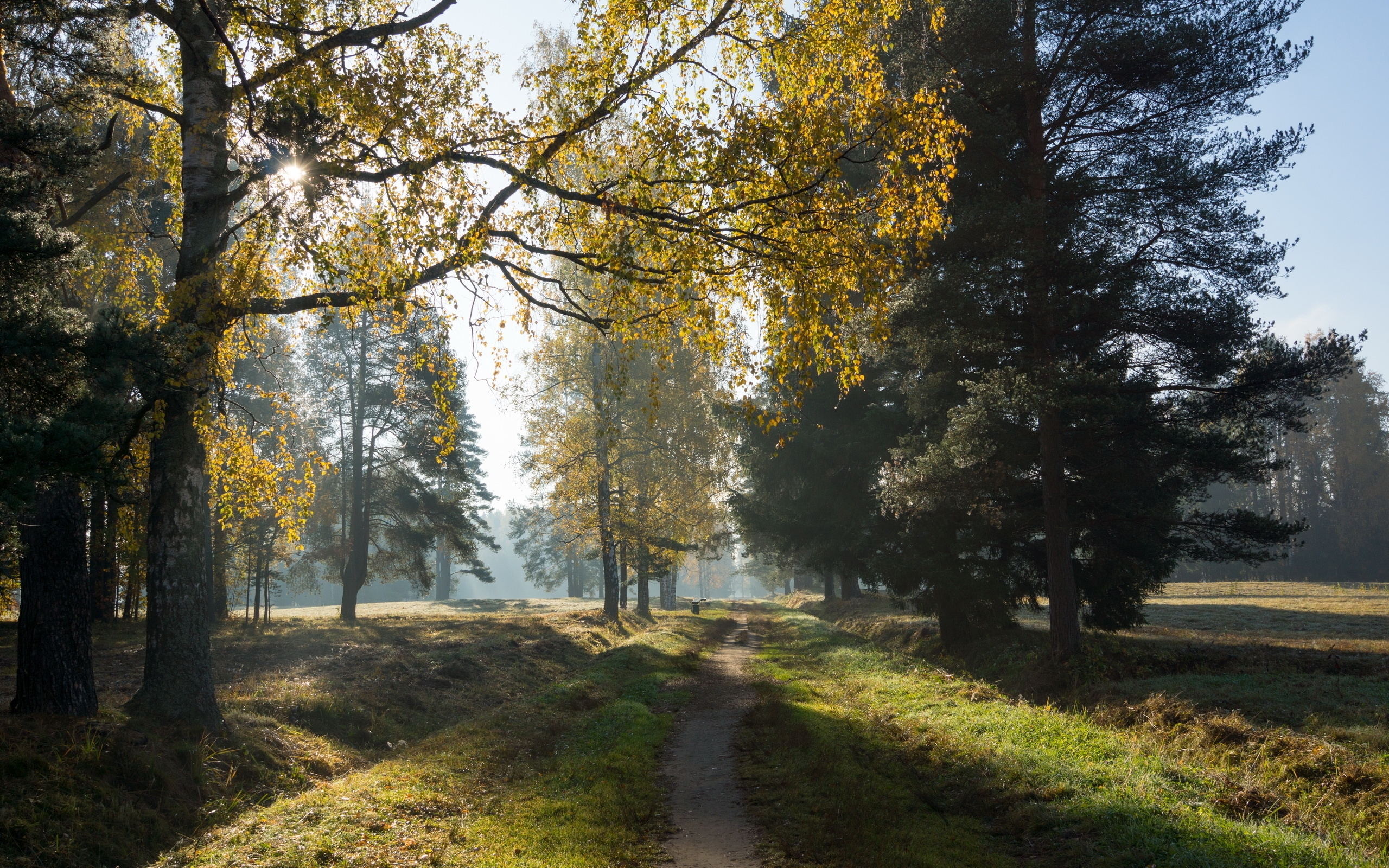 Description: A dirt path in a forest with trees and grass on both sides of it and a path leading to the right.