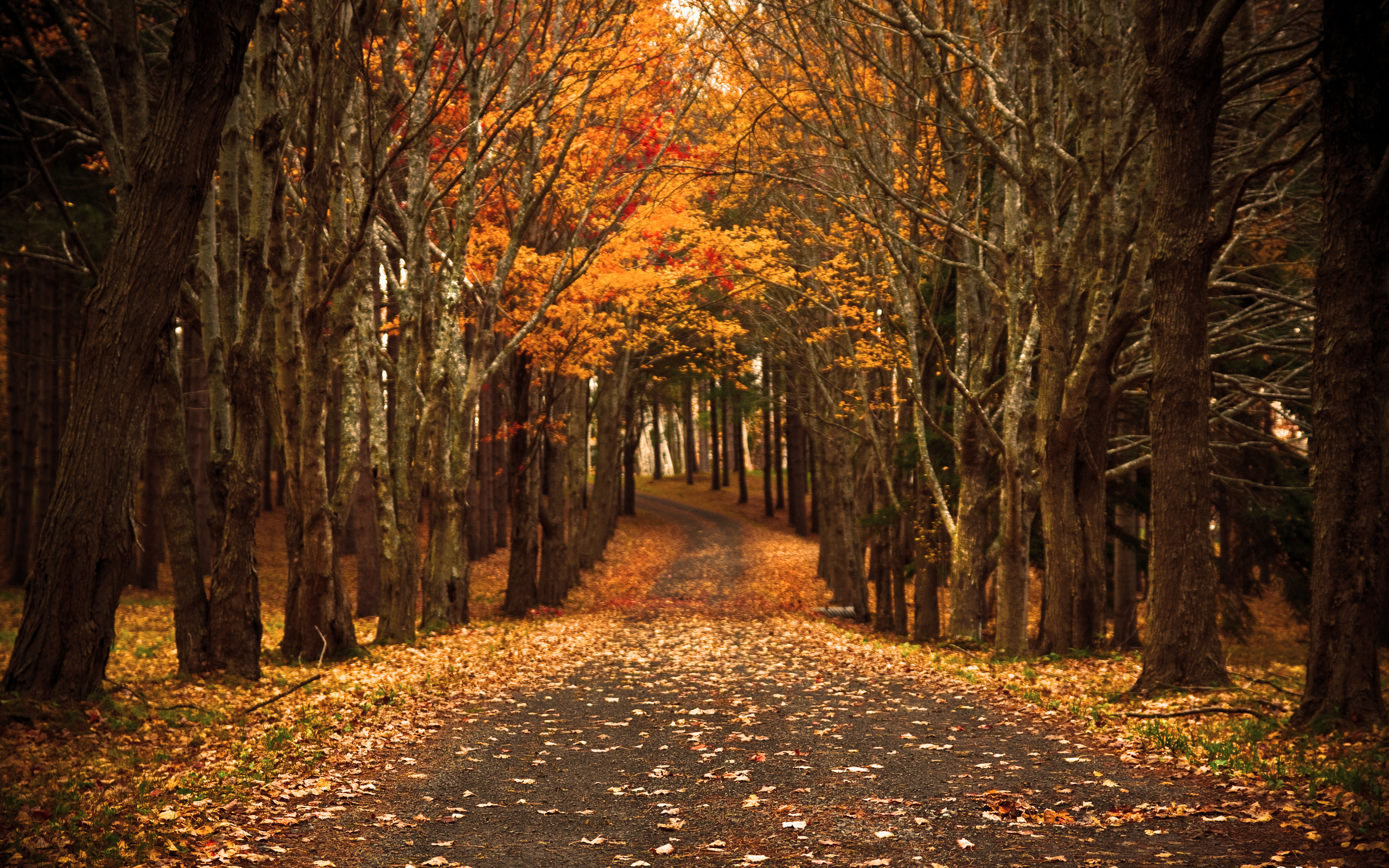 Description: A dirt road surrounded by trees with leaves on the ground and fallen leaves on the ground on either side.