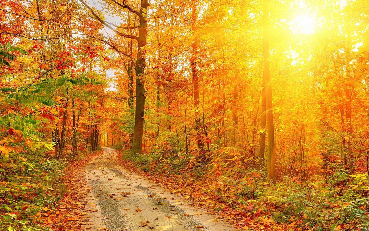 Description: A dirt road surrounded by trees and leaves in the fall season with the sun shining through the trees and leaves on the ground.
