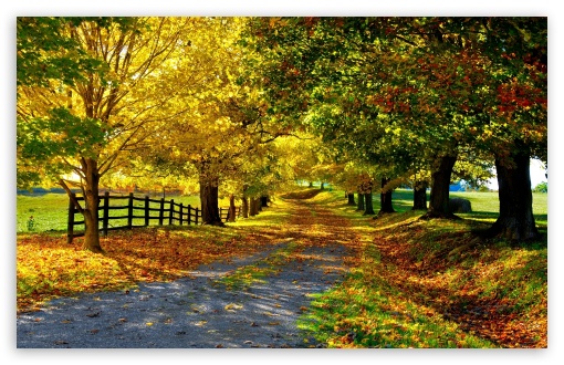 Description: A dirt road surrounded by trees and leaves in the fall colors of the trees and grass are all around.