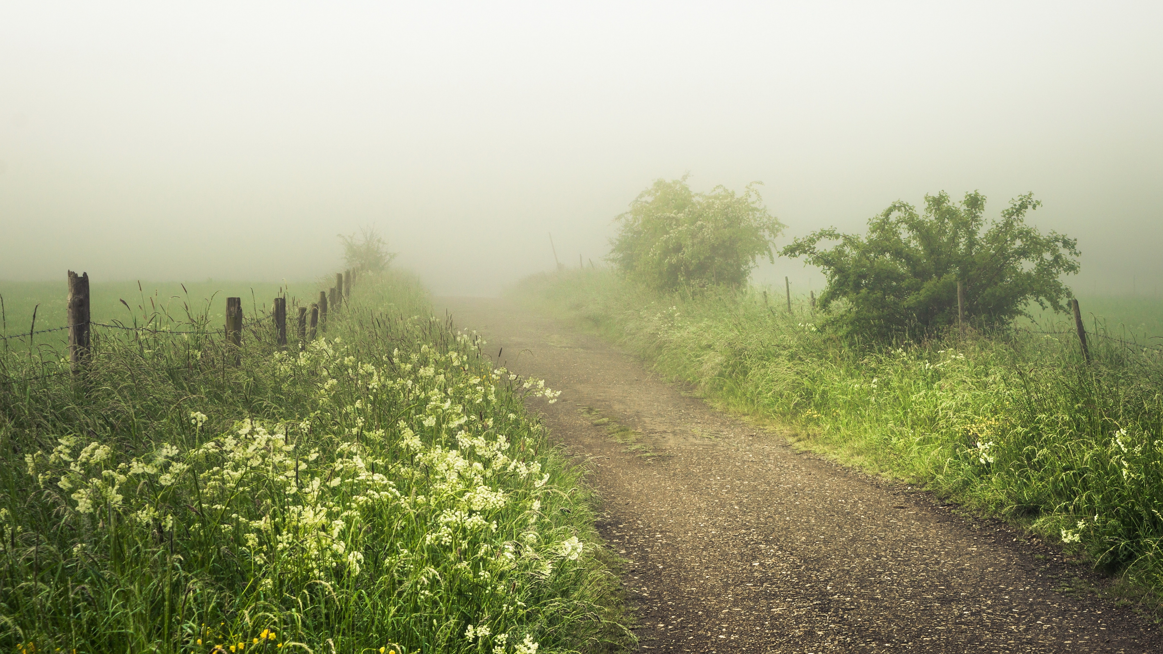 Description: A dirt road with a fence and flowers on the side of it in the foggy day with a few trees.