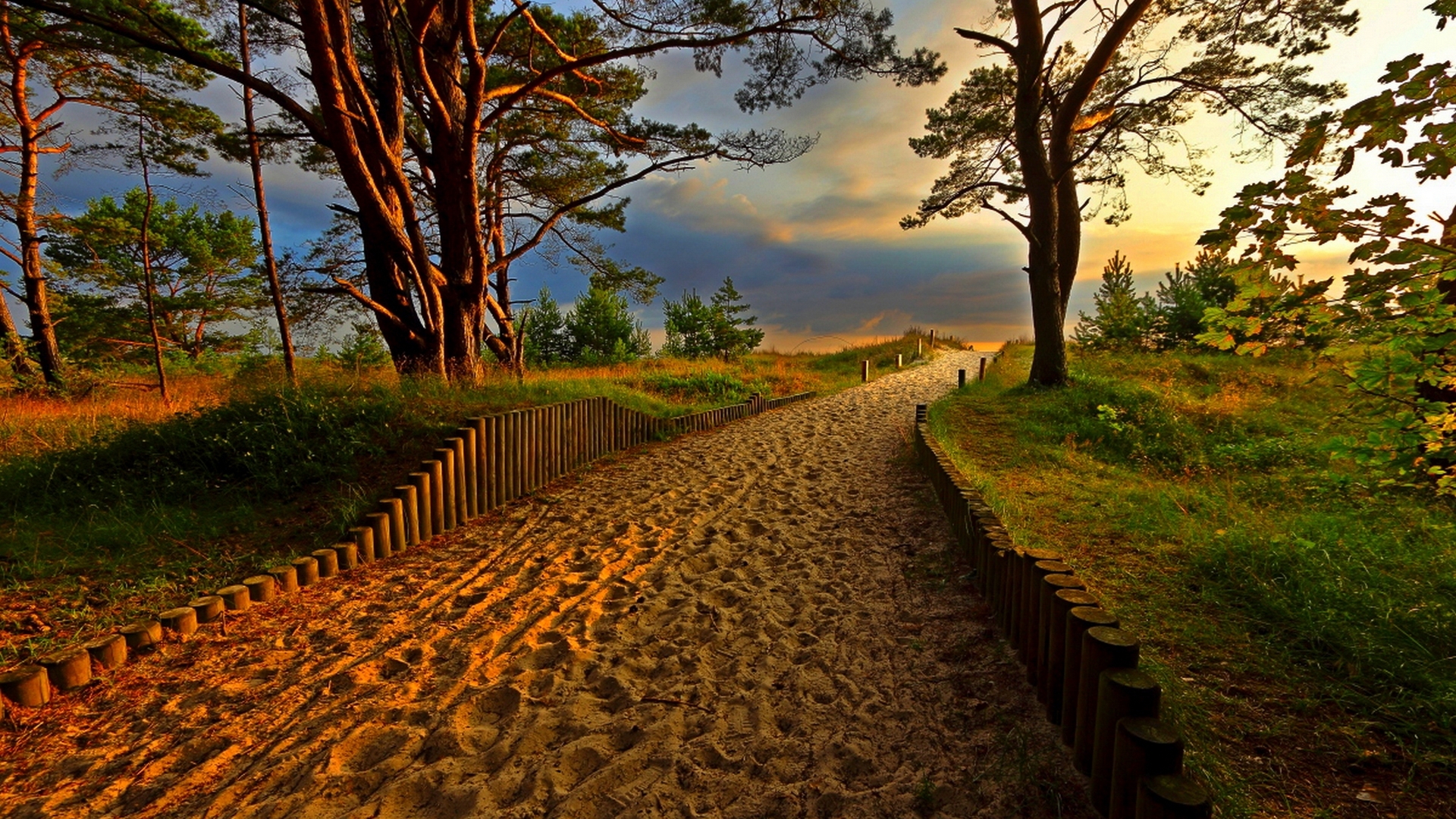 Description: A dirt road with a fence and trees on both sides of it and a cloudy sky in the background.