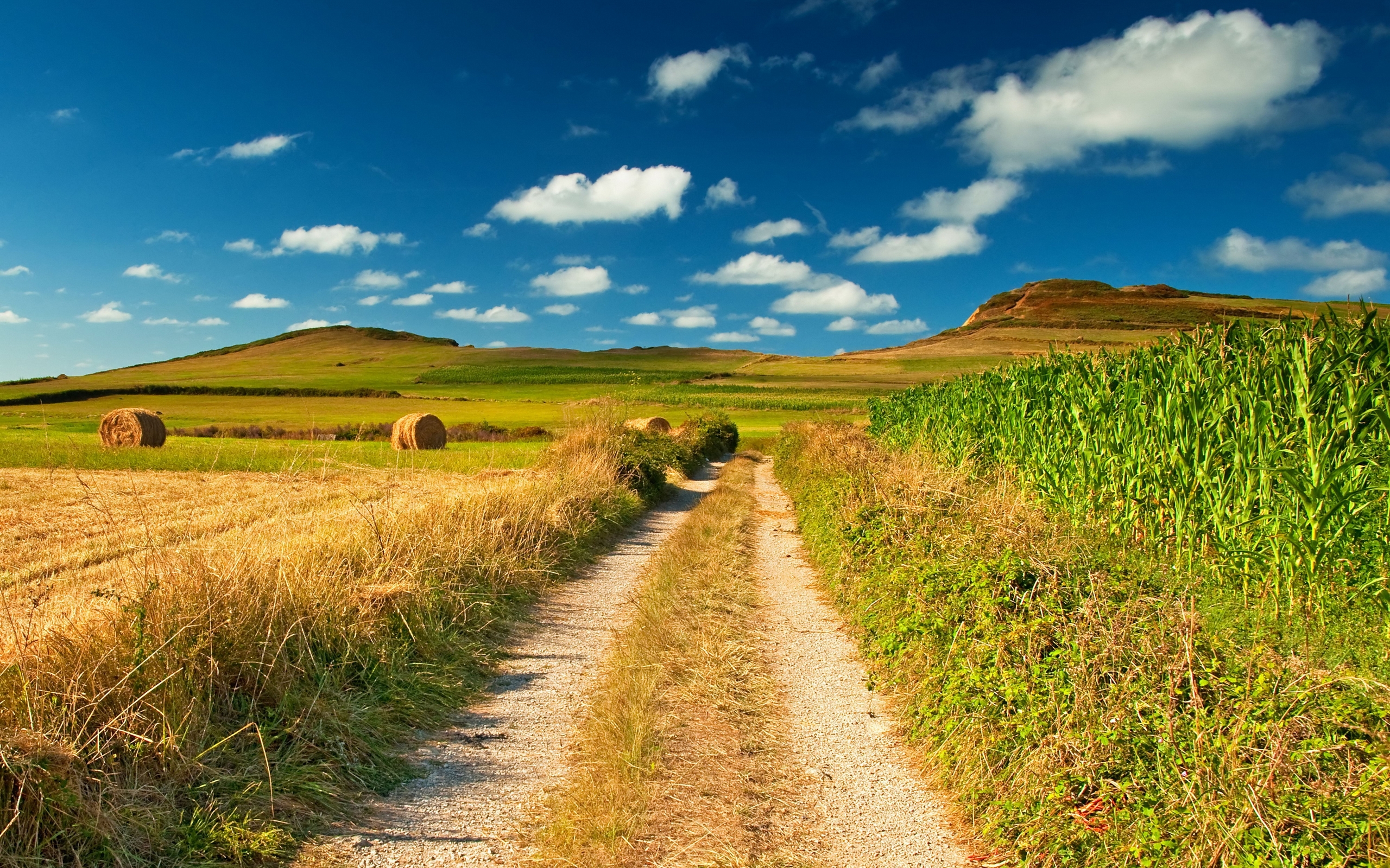 Description: A dirt road in a field with hay bales in the distance and a blue sky with clouds above.