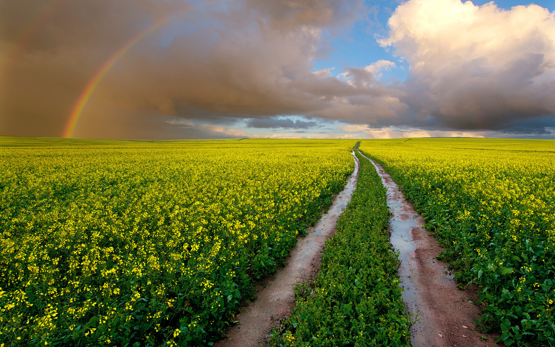 Description: A dirt road in a field with a rainbow in the background and a rainbow in the sky above it.
