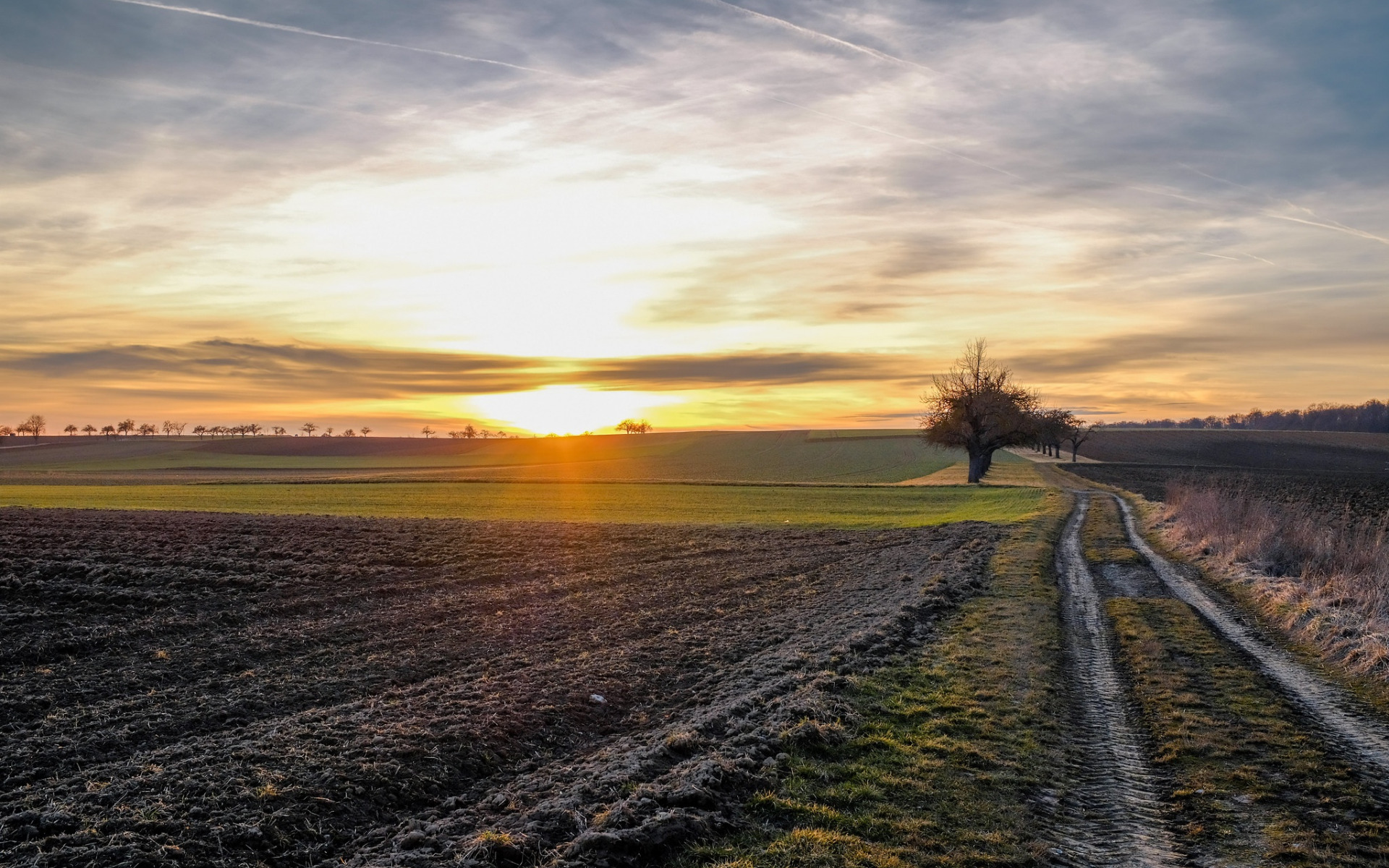 Description: A dirt road in a field with a tree in the distance at sunset or dawn with a single tree in the distance.