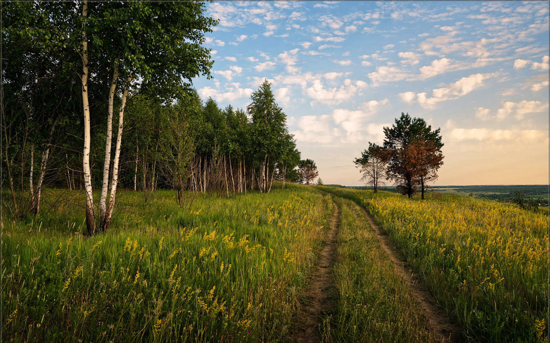 Description: A dirt road in a field with trees and grass on both sides of it and a sky with clouds.
