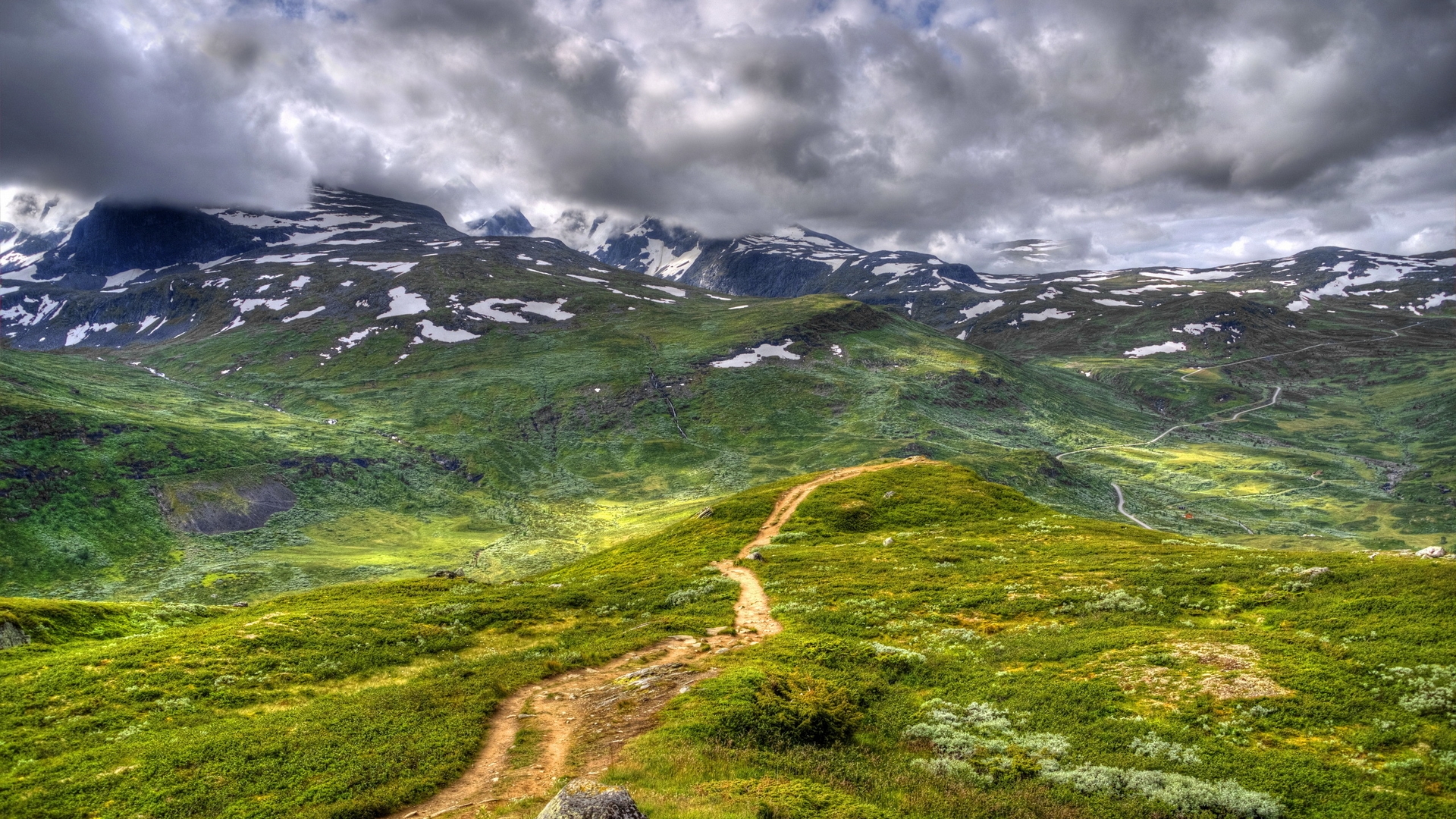 Description: A dirt road going up a grassy hill with a mountain in the background and clouds in the sky above.