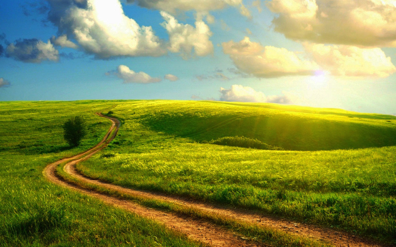 Description: A dirt road going through a green field under a cloudy sky with sunbeams and a tree on the side.