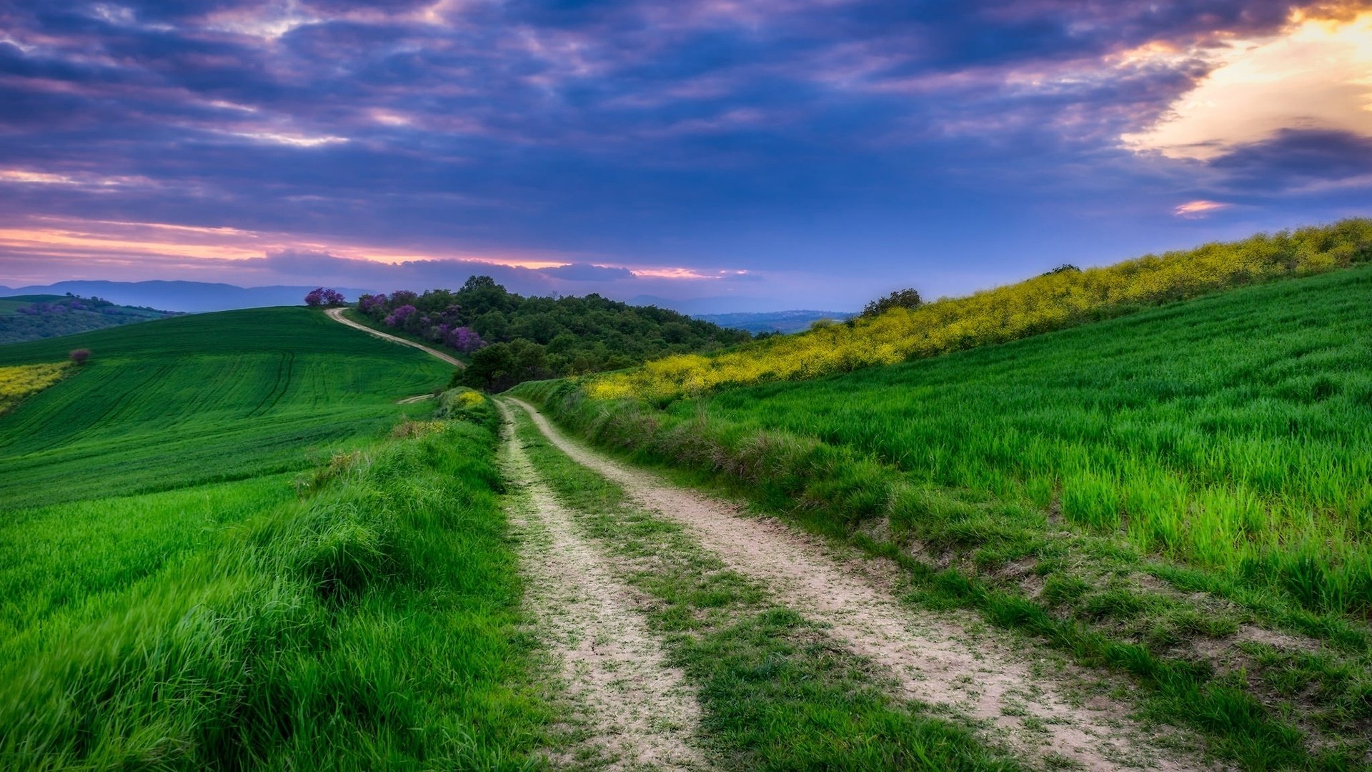 Description: A dirt road going through a lush green field under a cloudy sky with a tree on the side of the road.