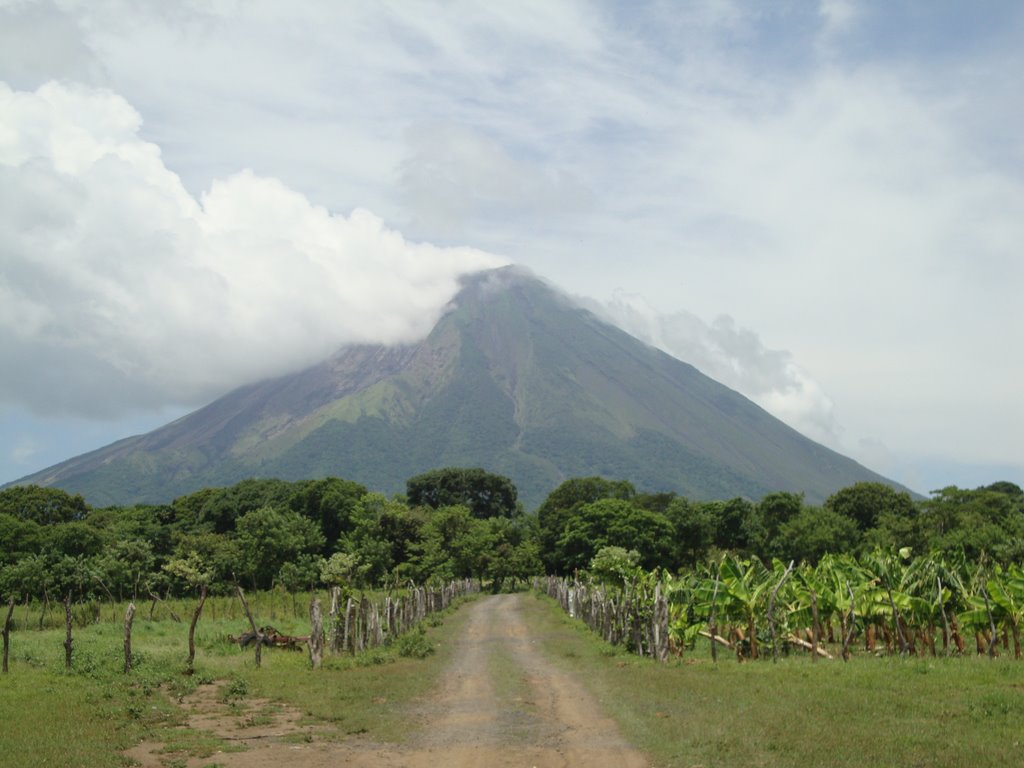 Description: A dirt road with a mountain in the background and trees on both sides of it and a field with a dirt road.