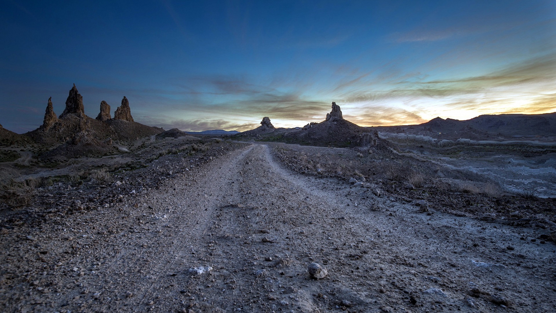 Description: A dirt road with a few rocks on the side of it and a sky with clouds above it and a few mountains in the distance.