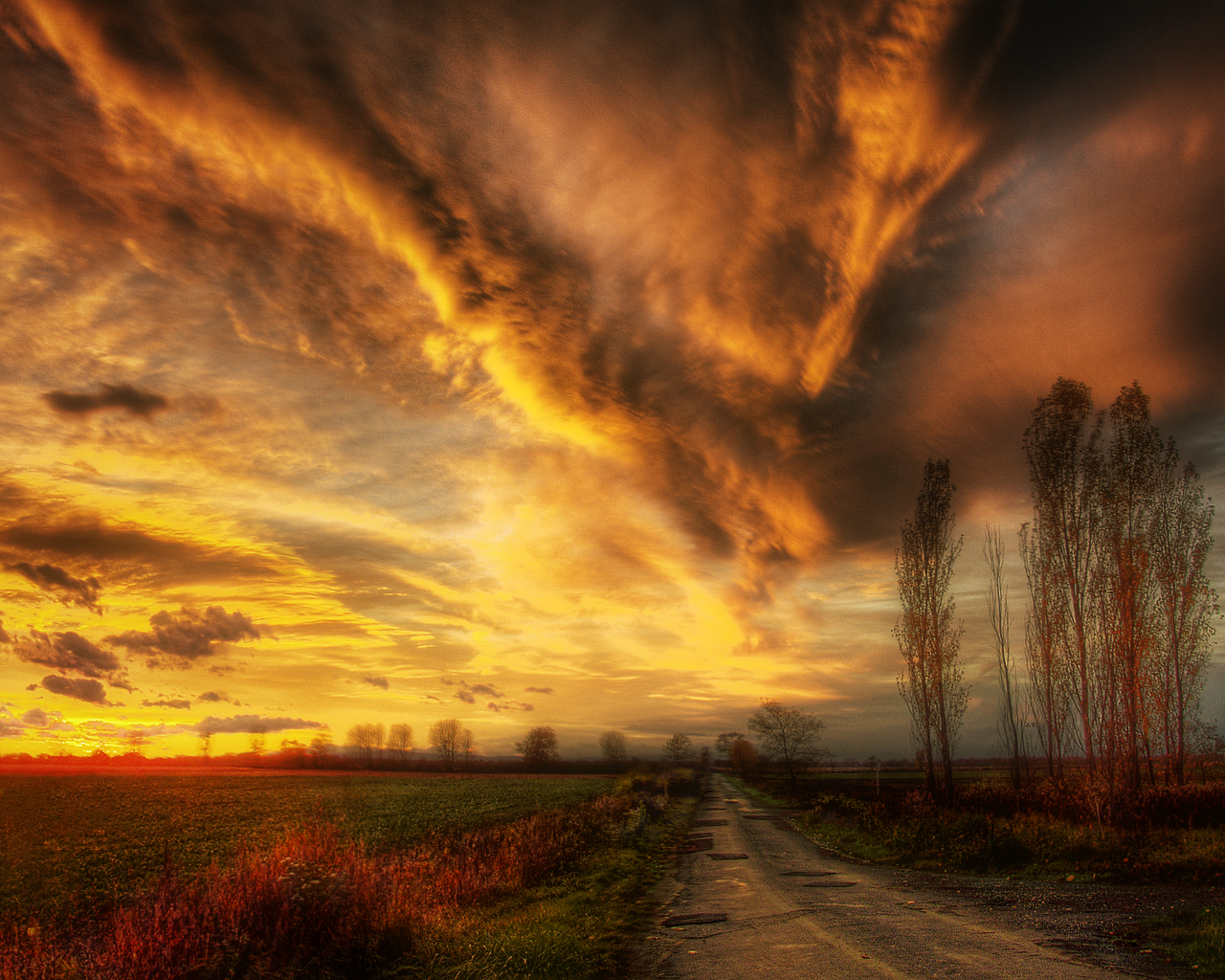 Description: A dirt road with a sunset in the background and clouds in the sky above it and a field with red flowers.