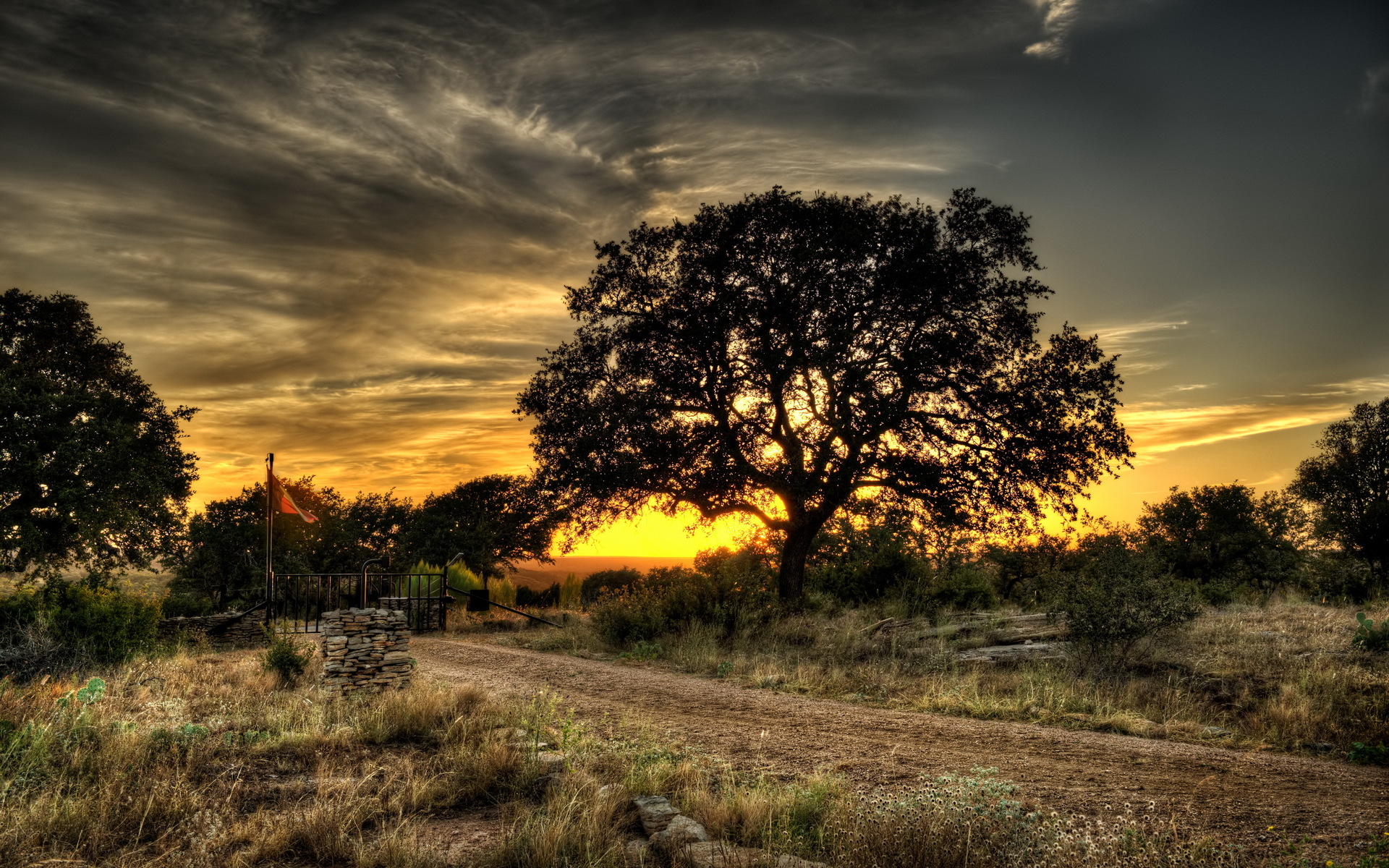 Description: A dirt road with a tree and a sunset in the background with clouds in the sky above it and a dirt path leading to the right.