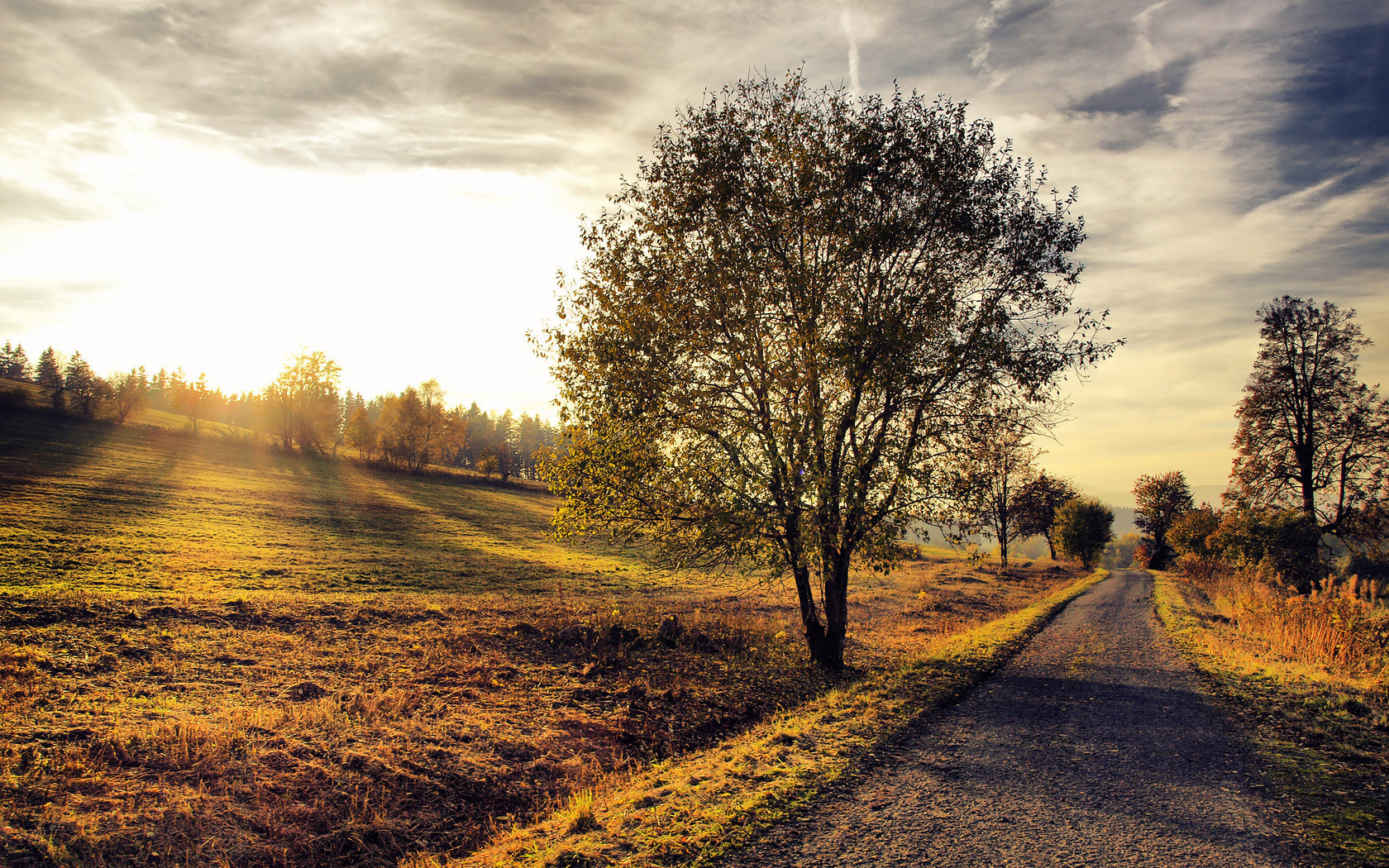 Description: A dirt road with a tree on the side of it and a field in the background with grass and trees.