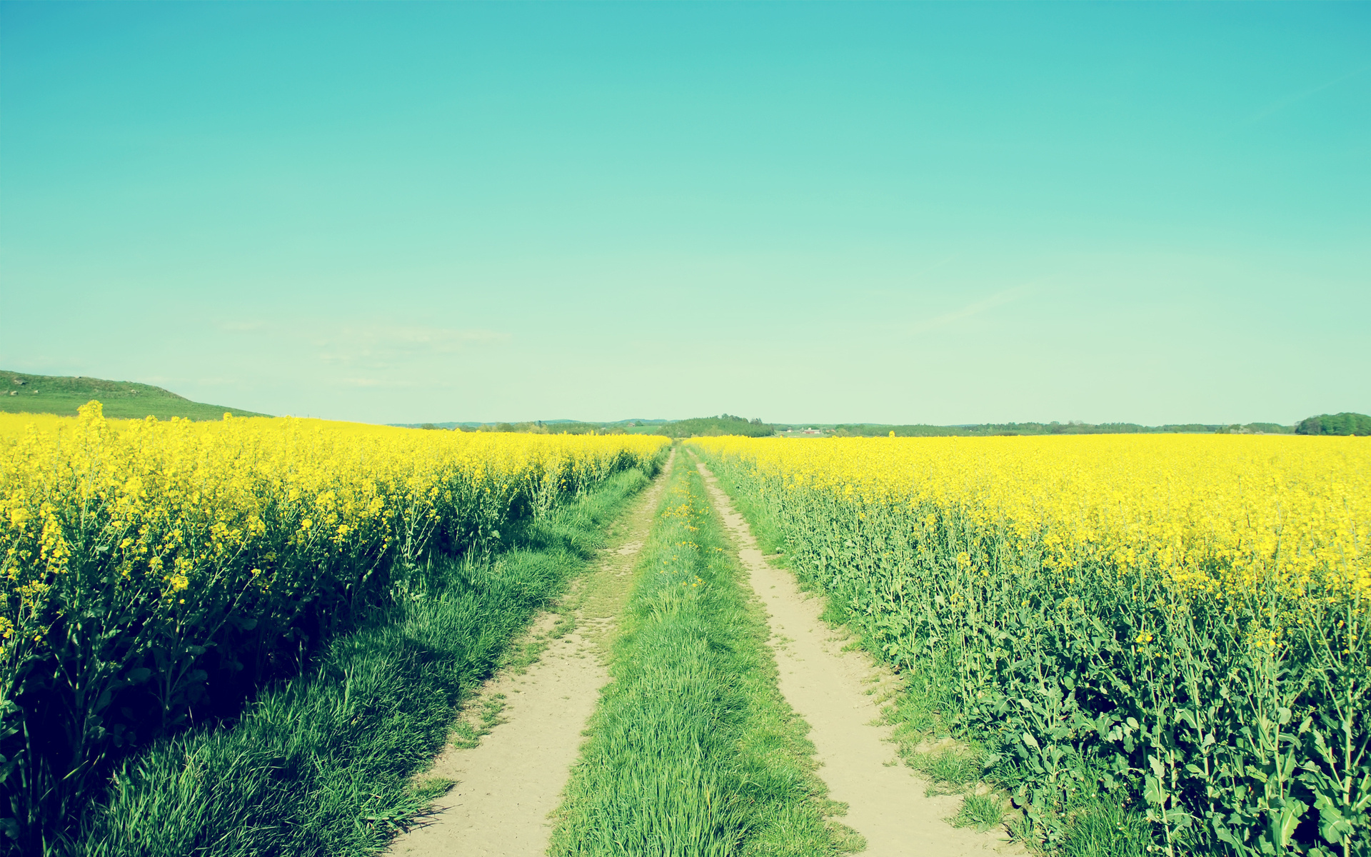 Description: A dirt road in a field of yellow flowers and a blue sky in the background with a green field.