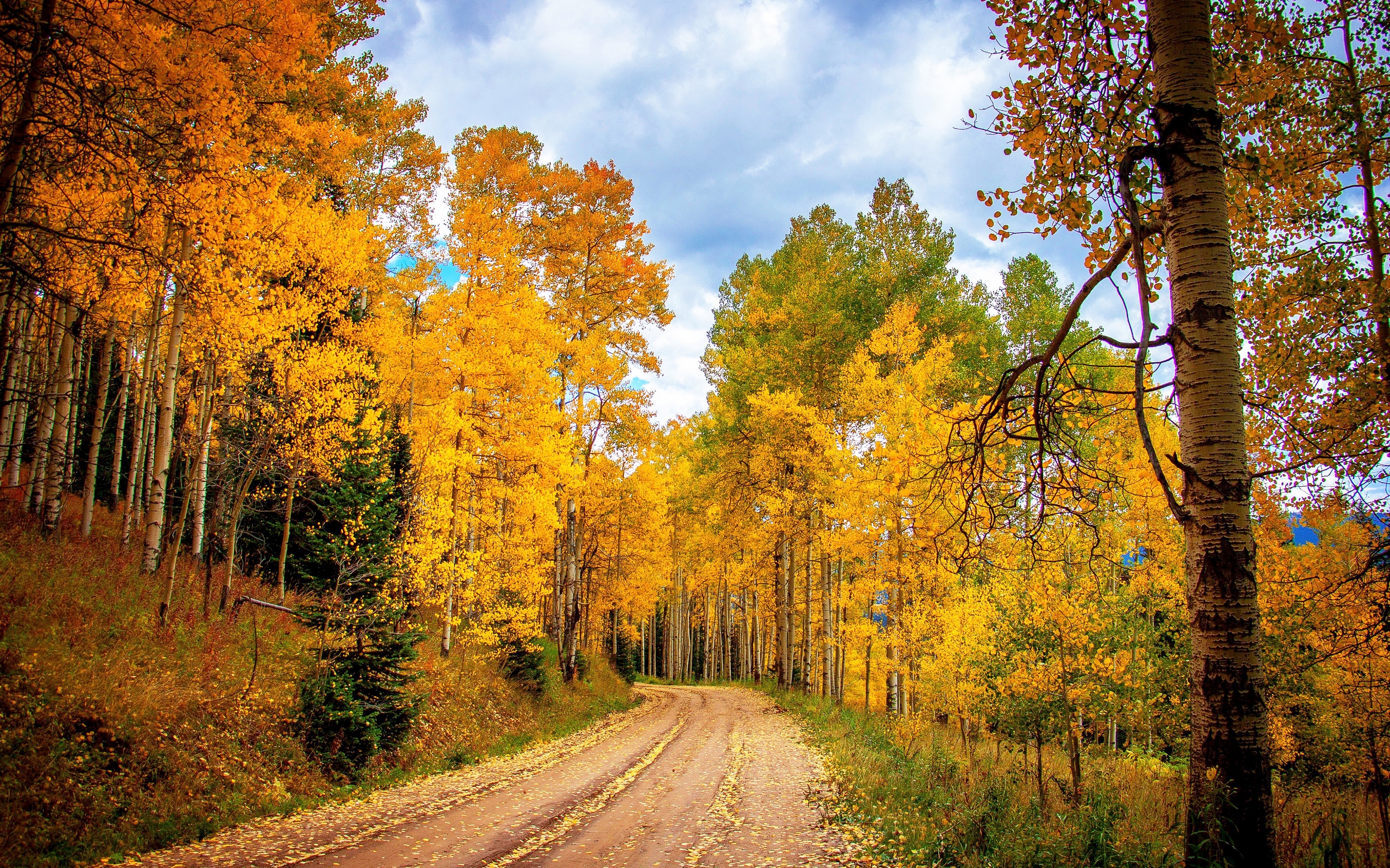 Description: A dirt road surrounded by trees with yellow leaves on it and a blue sky with clouds above it and a few yellow trees.