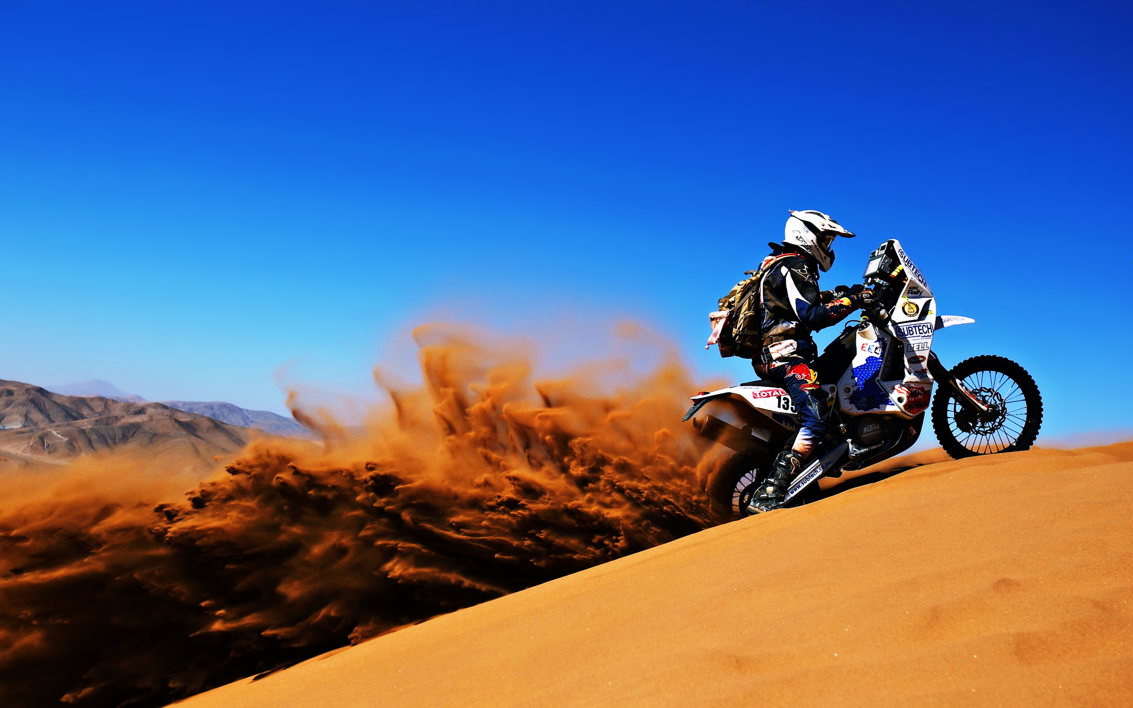 Description: A person riding a dirt bike on a sandy hill side in the desert with a blue sky in the background.