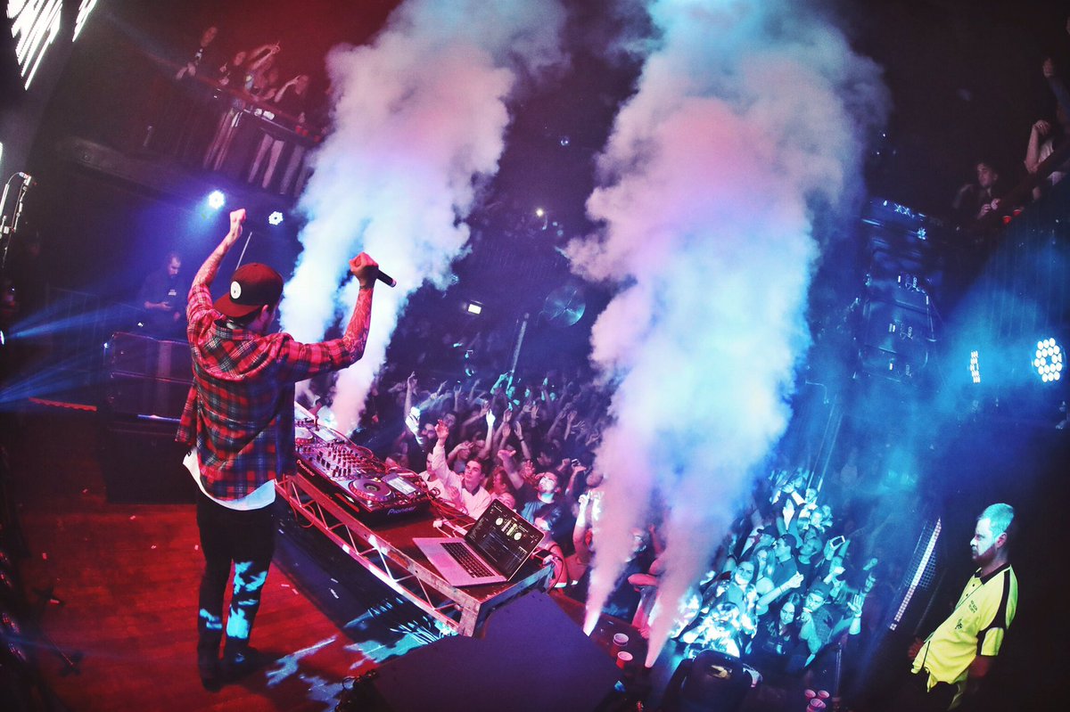 Description: A dj mixing on a stage with smoke coming out of it and people watching from the sidelines of the stage.
