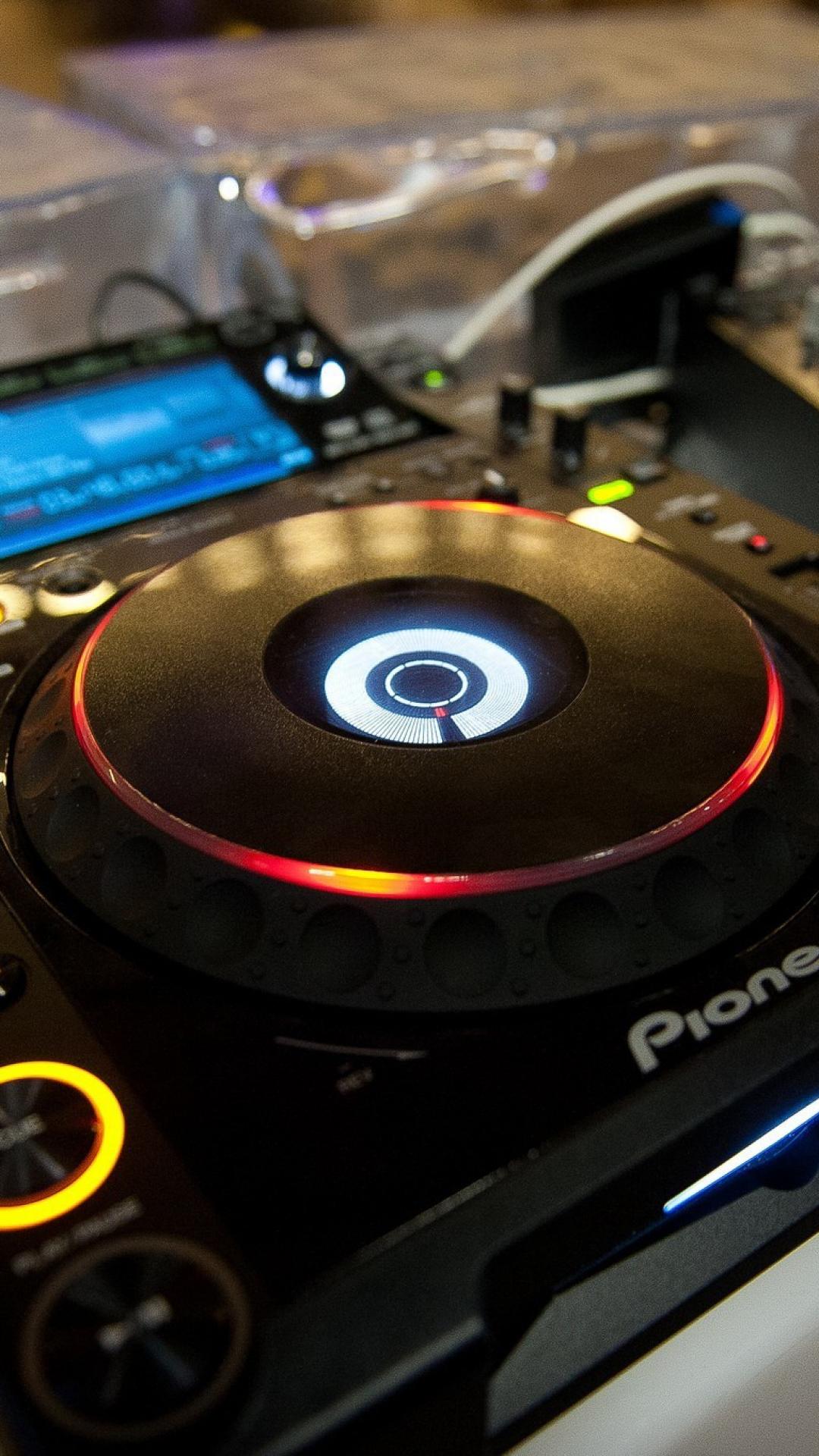 Description: A close up of a dj player with a remote control on a table with other electronic devices in the background.