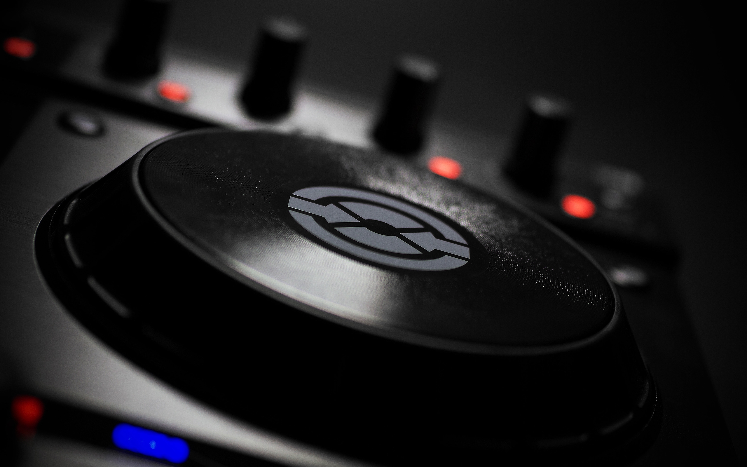 Description: A close up of a dj's turntable with buttons and lights on it's side and a black background.