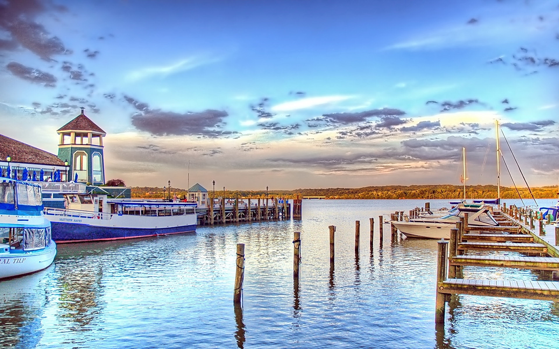 Description: A dock with several boats docked at it and a clock tower in the background at sunset or dawn or dawn.
