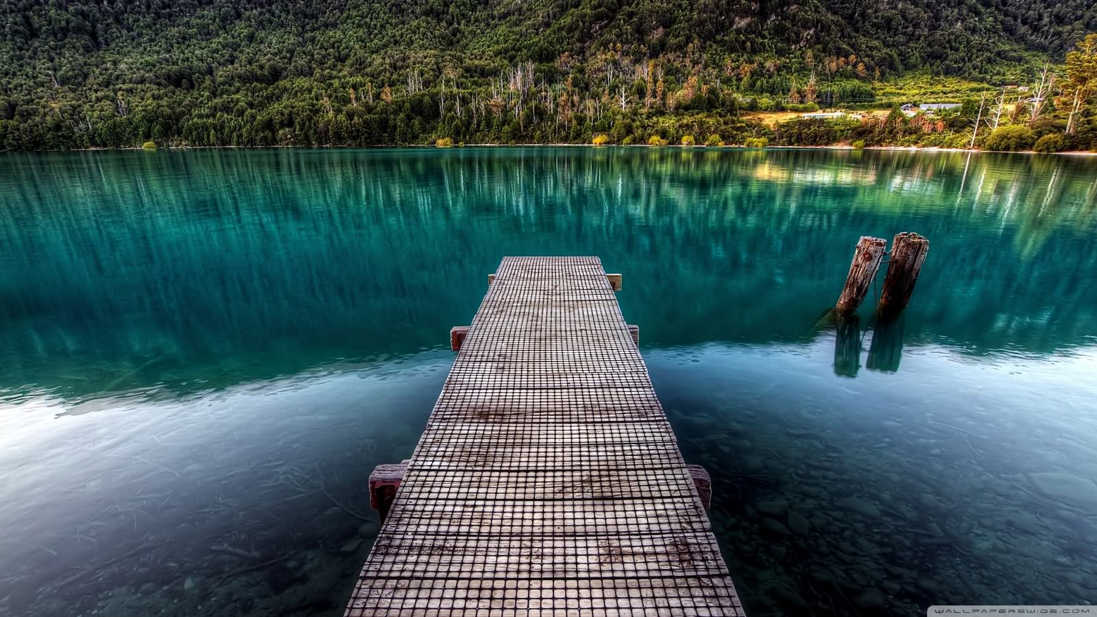 Description: A dock that is sitting in the water near a mountain range and a lake with clear blue water and a forest.