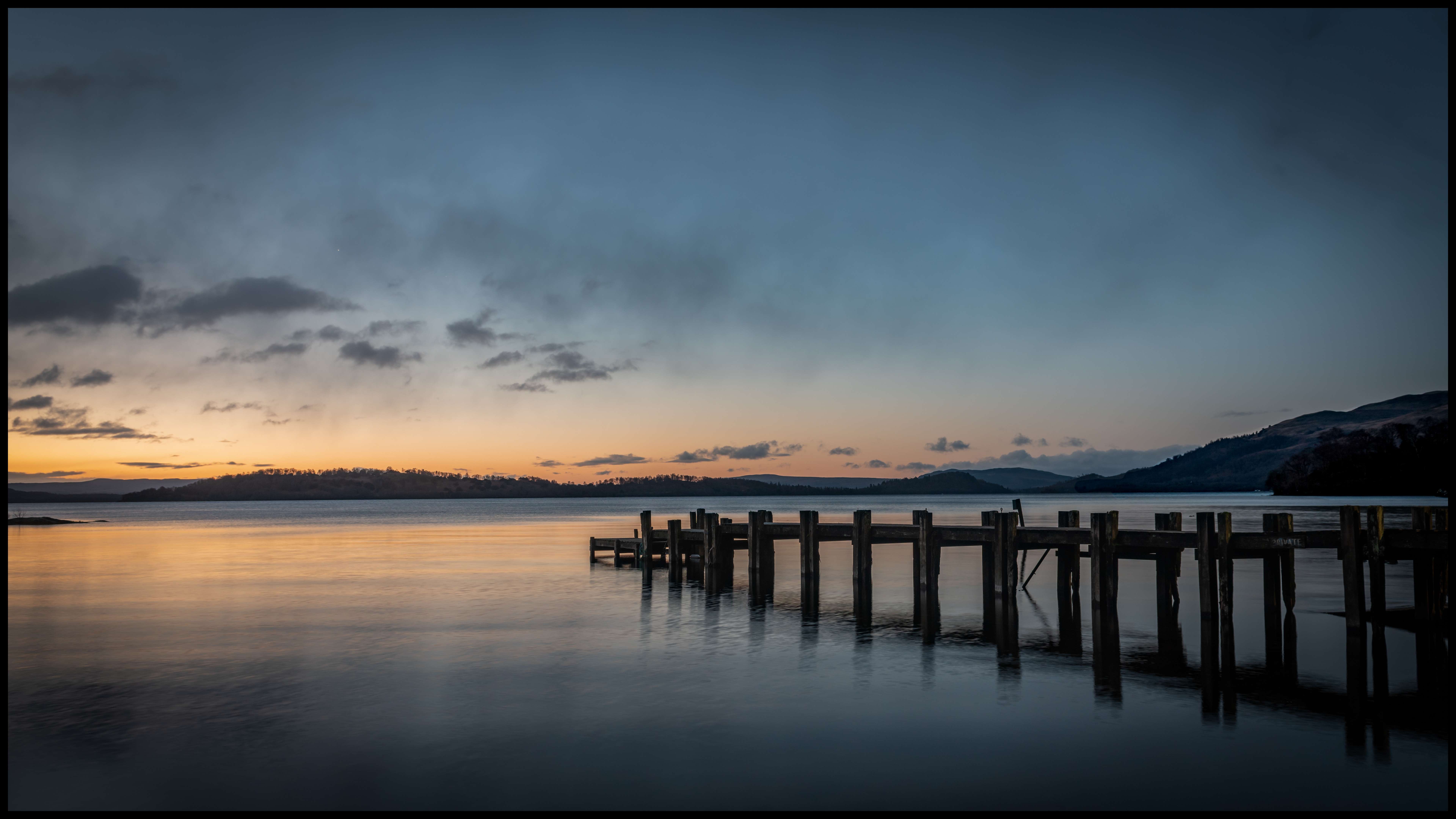 Description: A long dock sitting on top of a lake under a cloudy sky at sunset with mountains in the distance.