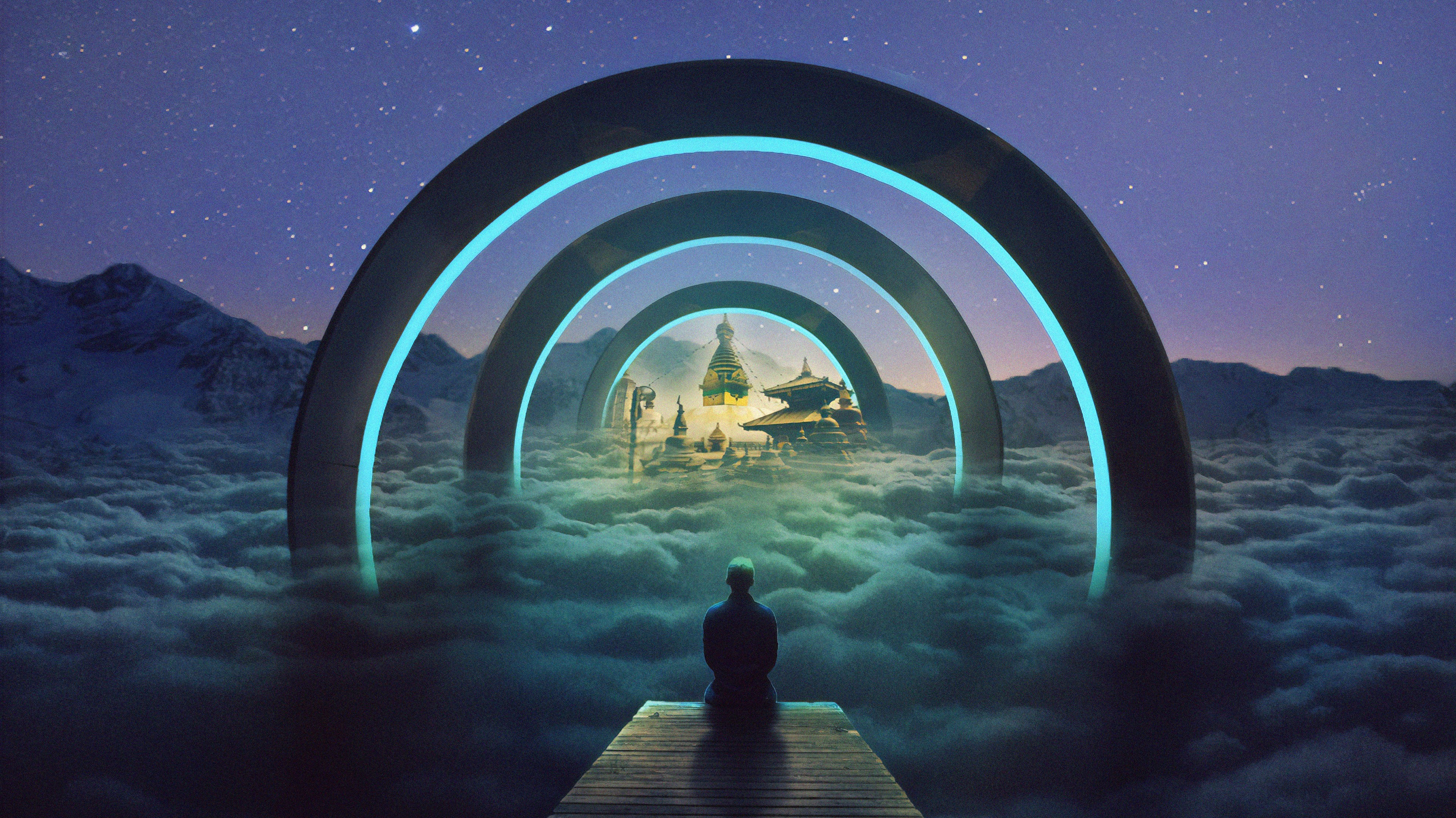 Description: A man standing on a dock in the middle of a sea of clouds with a castle in the distance.