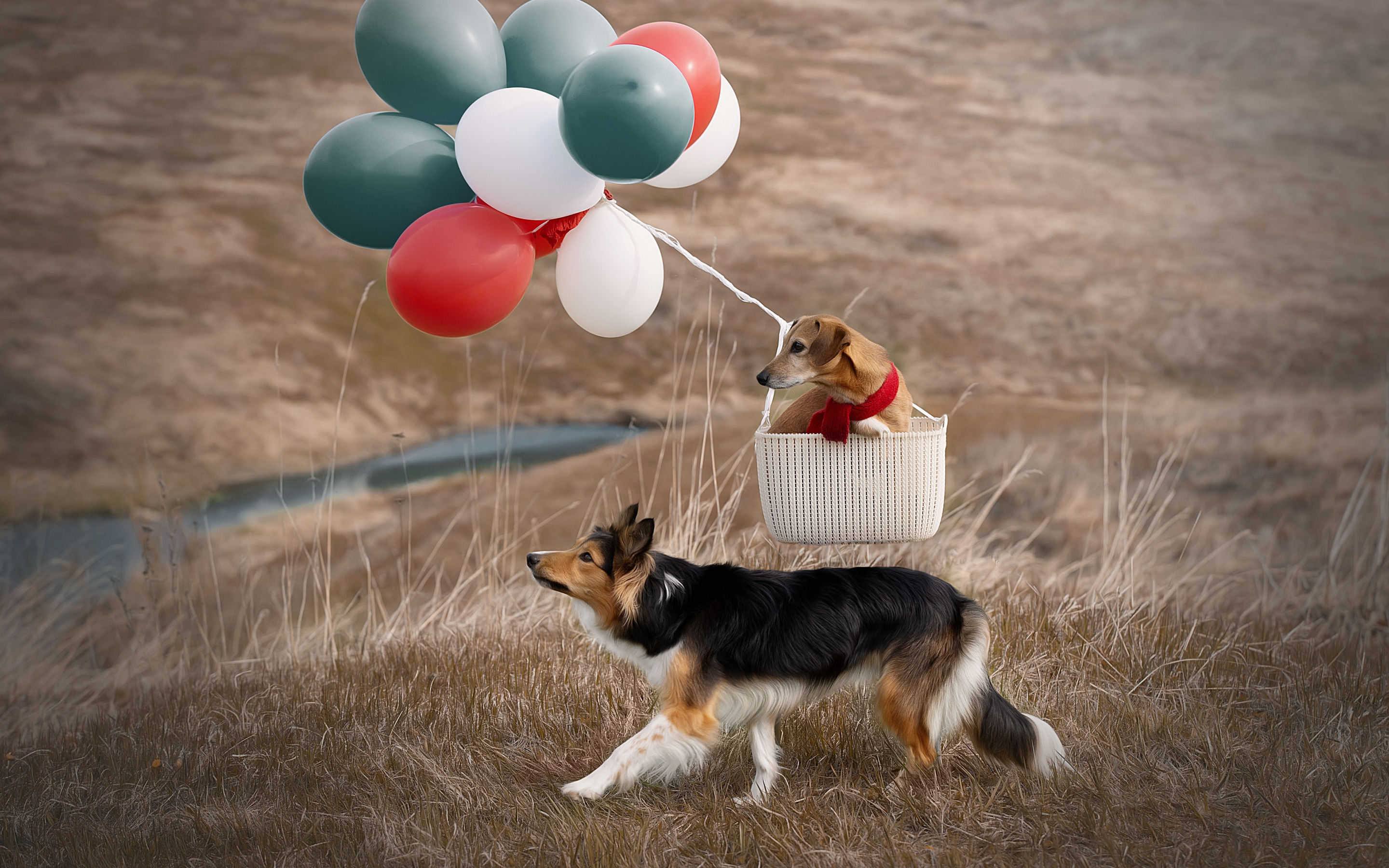 Description: A dog is pulling a basket with balloons attached to it while another dog is looking on from the other side.
