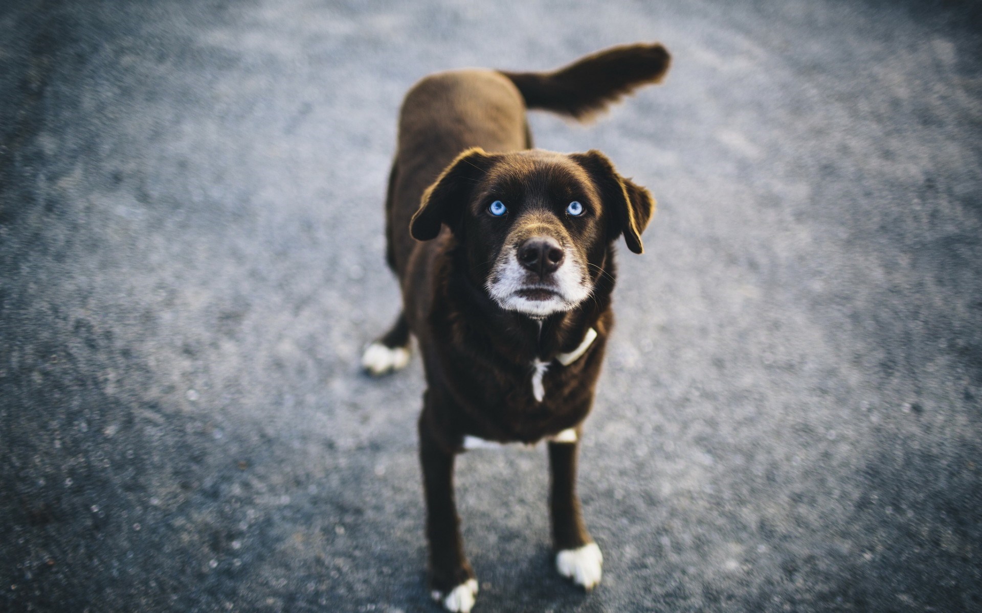 Description: A dog with blue eyes standing on a paved area with a black background and a white spot on the top of the dog's head.
