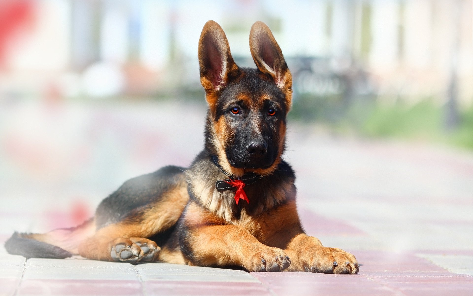 Description: A dog laying on a tiled floor with a red bow tie on it's collar and ears hanging down.