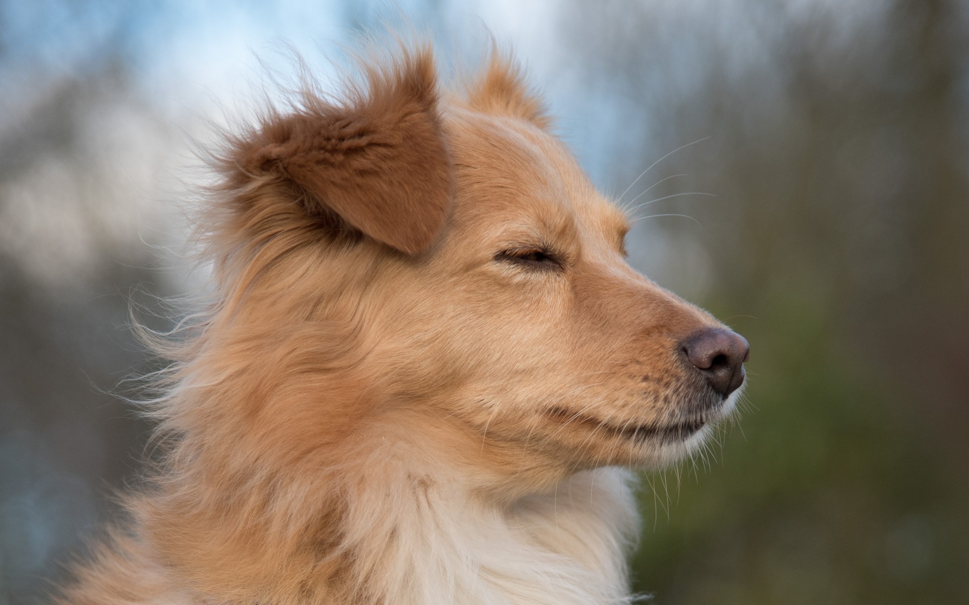 Description: A dog with a brown fur and a white face and head looking to the side with trees in the background.