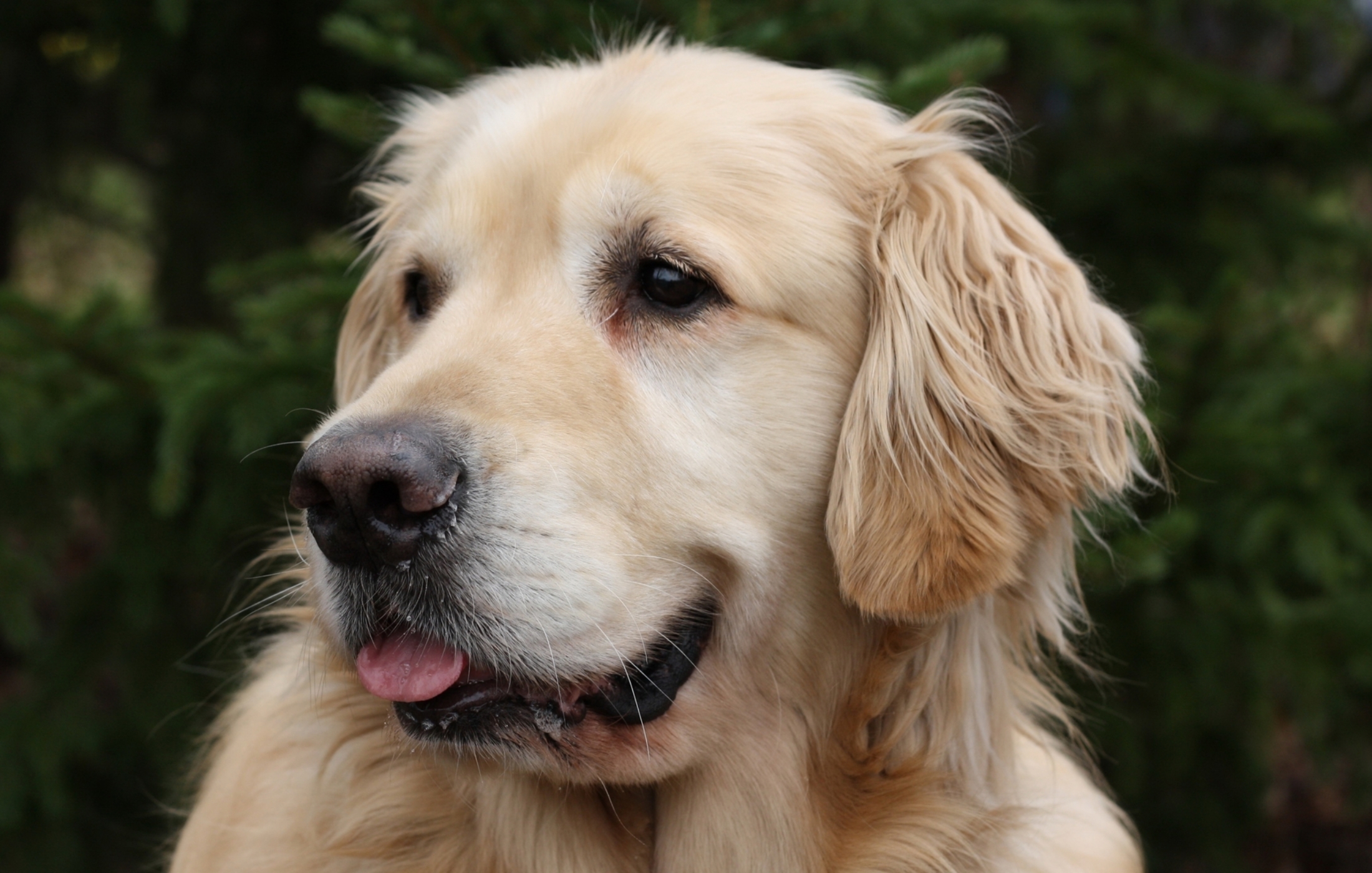 Description: A close up of a dog with a bush in the background and trees in the background.