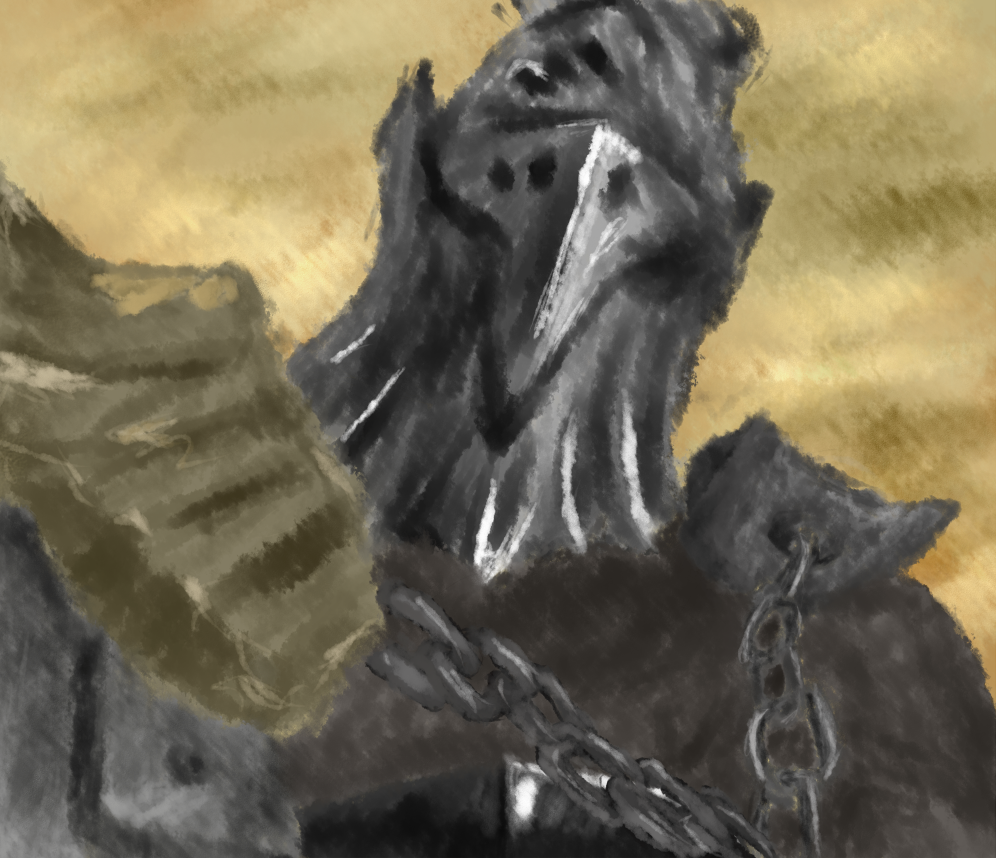 Description: A drawing of a dog with a chain around its neck and a shoe on its back.