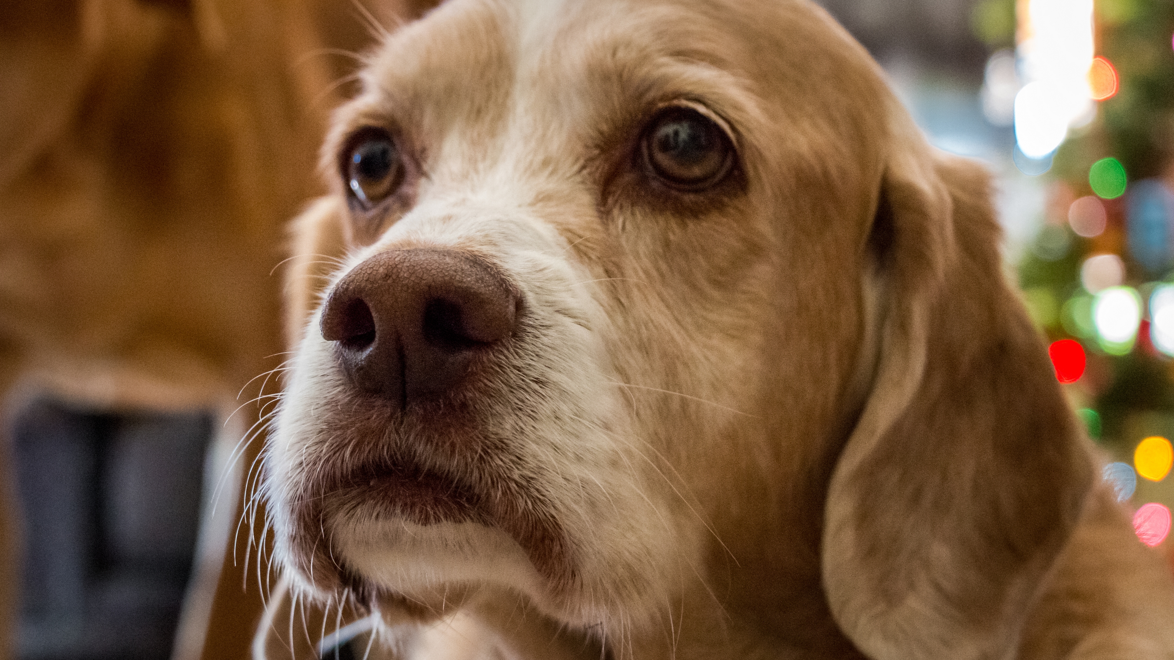 Description: A dog looking at the camera with a christmas tree in the background with lights on it's sides.
