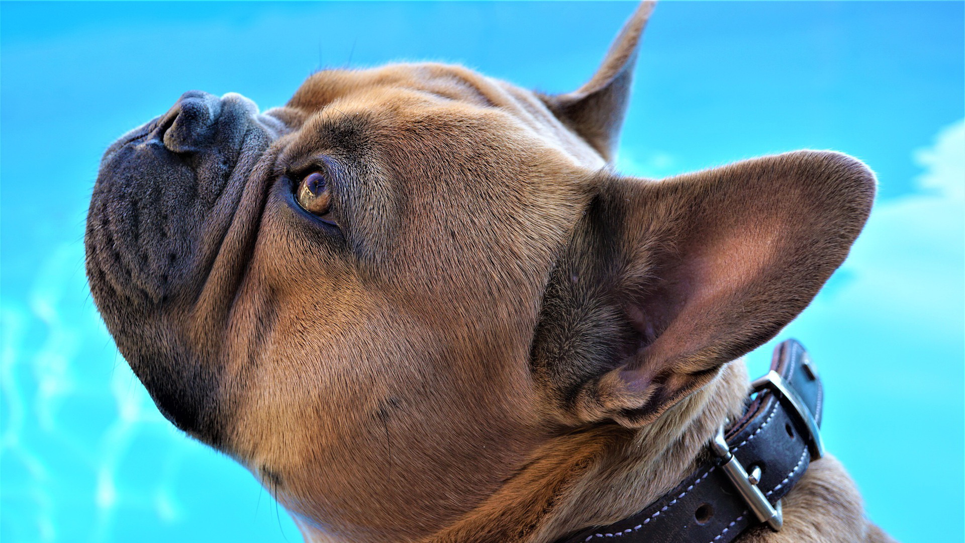 Description: A dog with a collar looking up at the sky with a pool in the background with a blue sky.