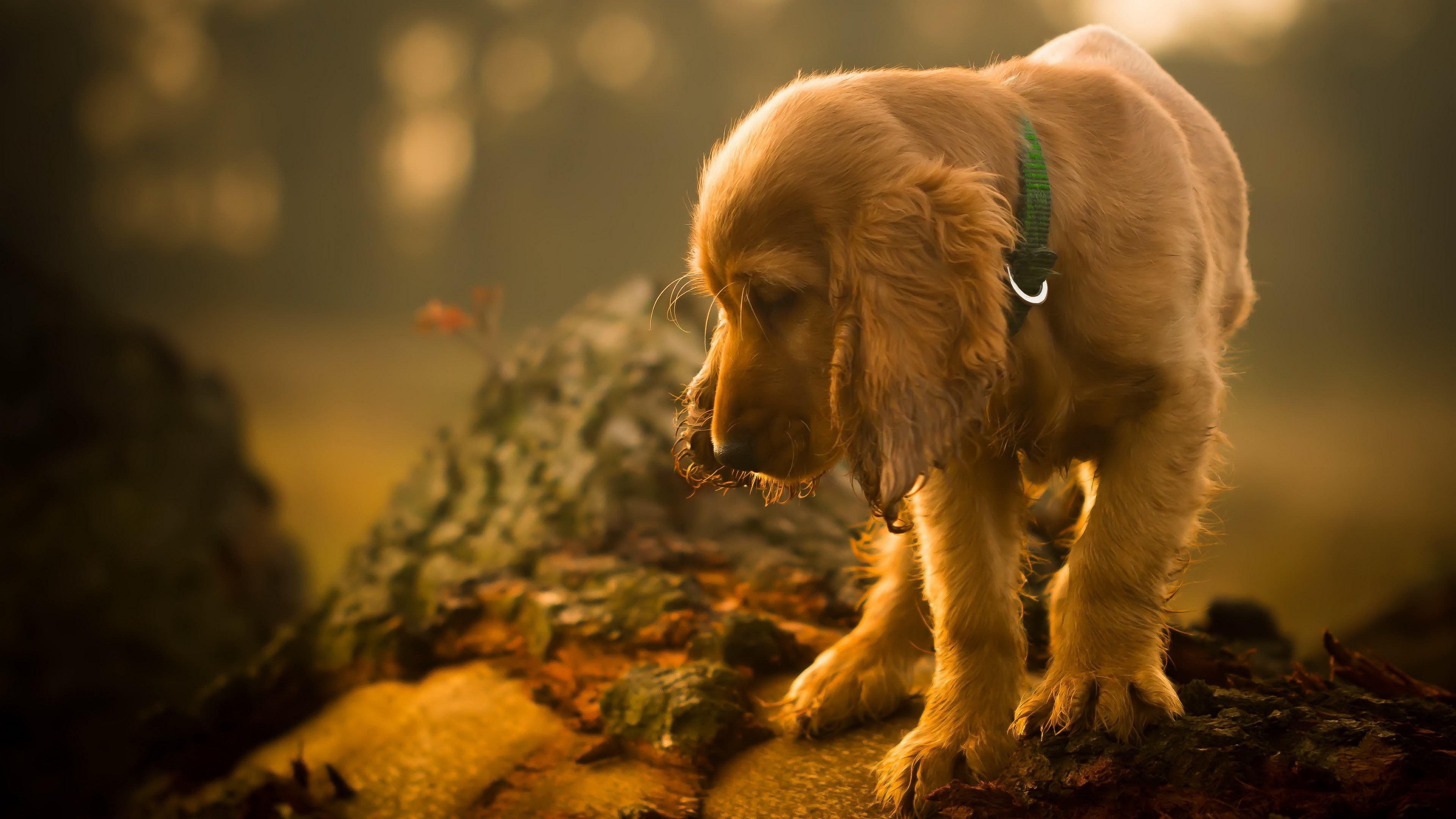 Description: A dog with a collar on standing on a rock in the woods with a tree stump in the background.