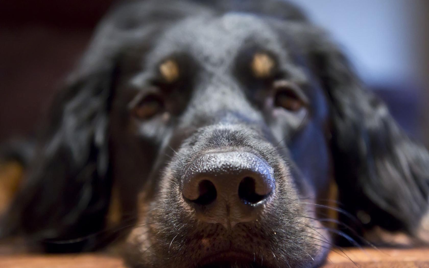 Description: A close up of a dog's face with it's nose resting on a table top with its eyes closed.