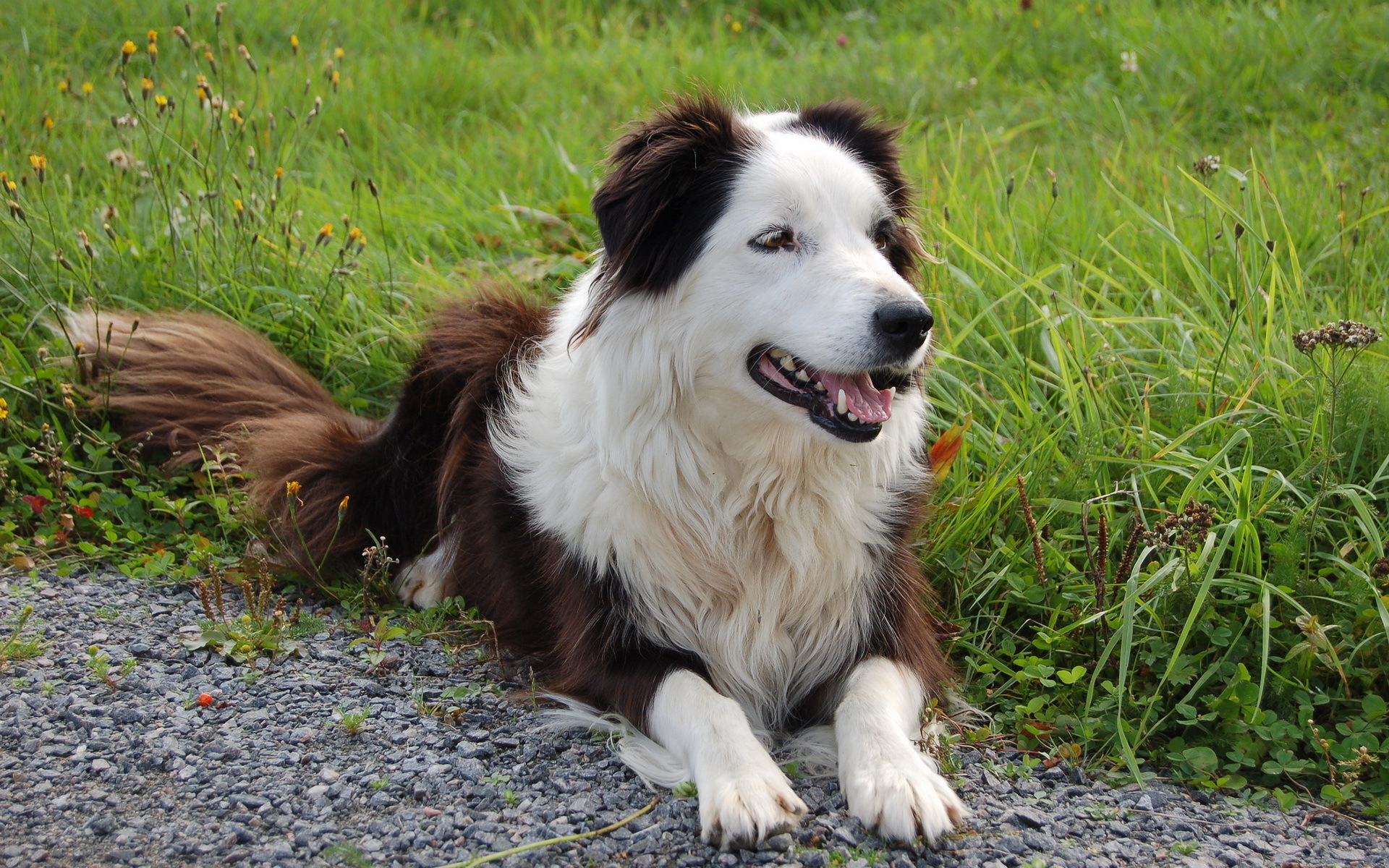 Description: A dog laying on a gravel road in a field of grass and flowers with its tongue out and tongue out.