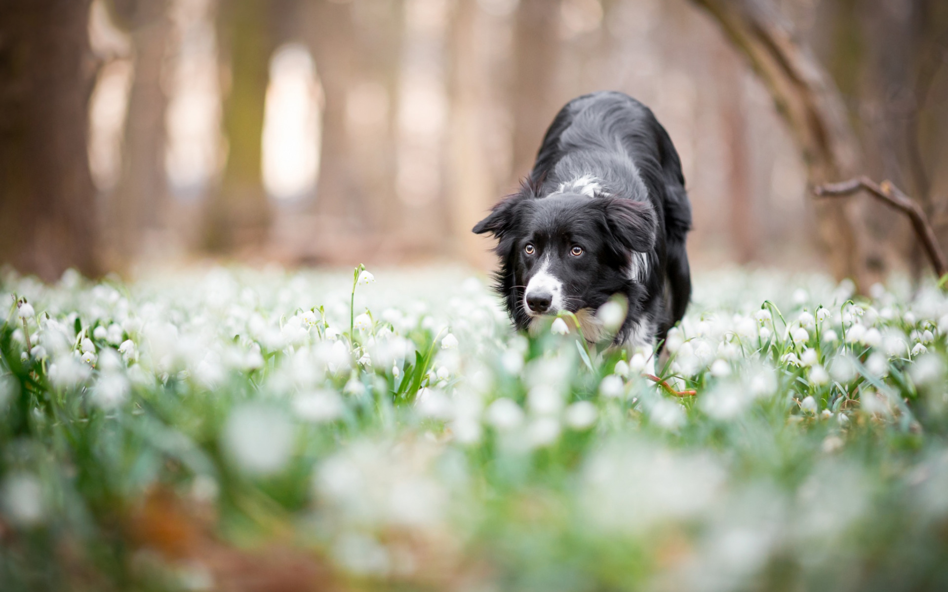 Description: A dog is walking through a field of flowers in the woods with trees in the background and snowdrops in the foreground.