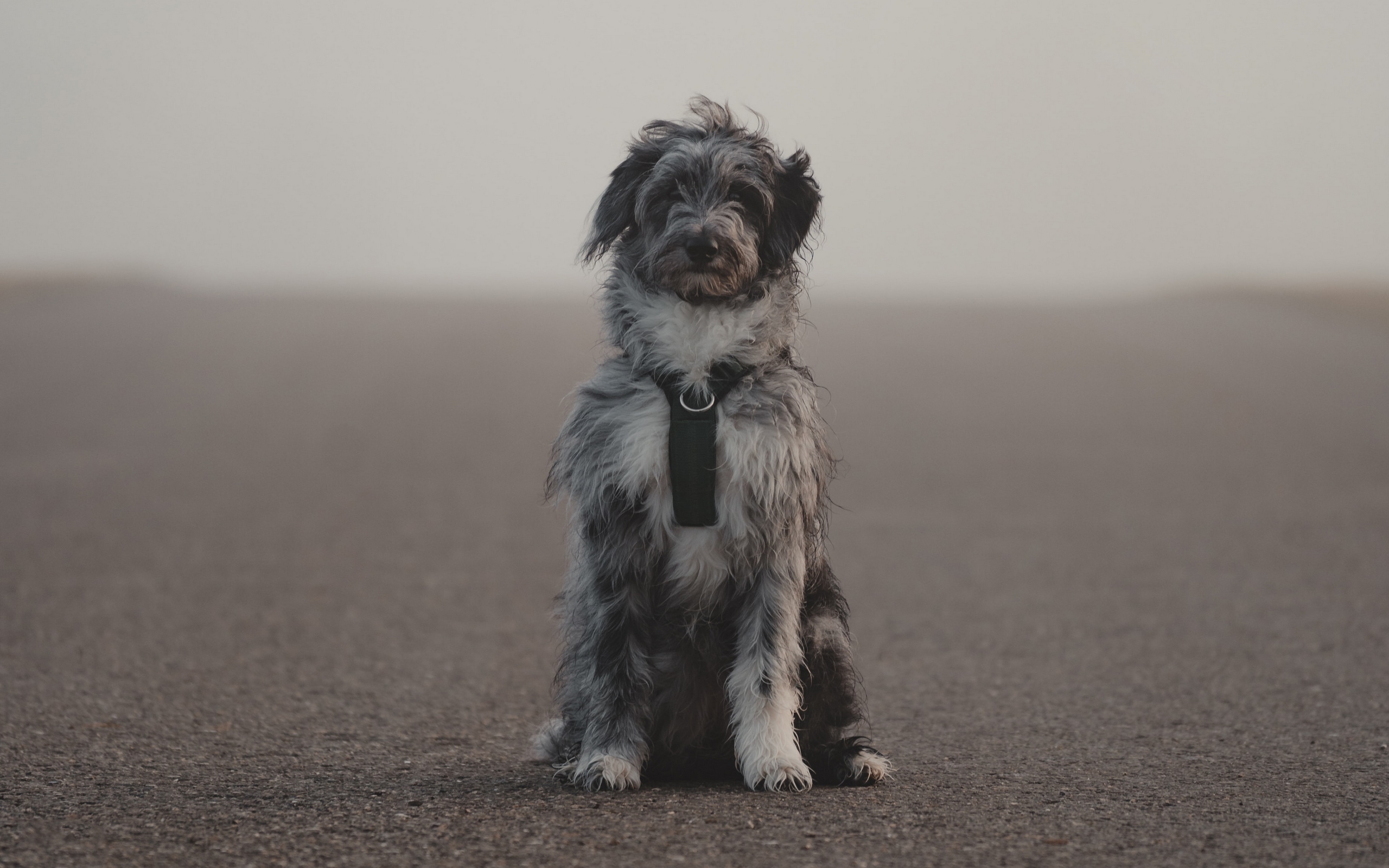 Description: A dog sitting on the ground with a tie around its neck and a collar around its neck.