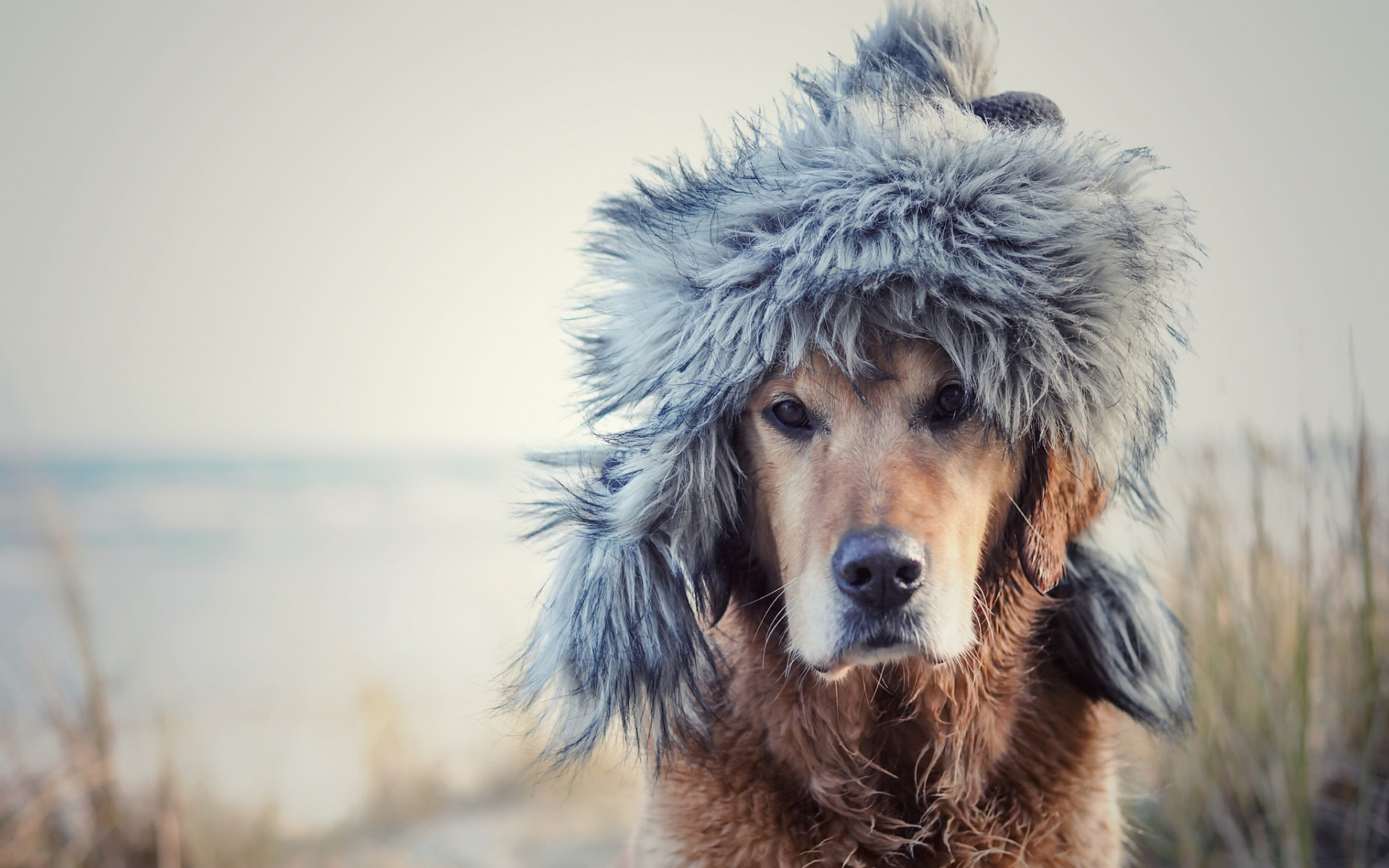 Description: A dog with a furry hat on its head standing on a beach near the ocean and grass in the foreground.