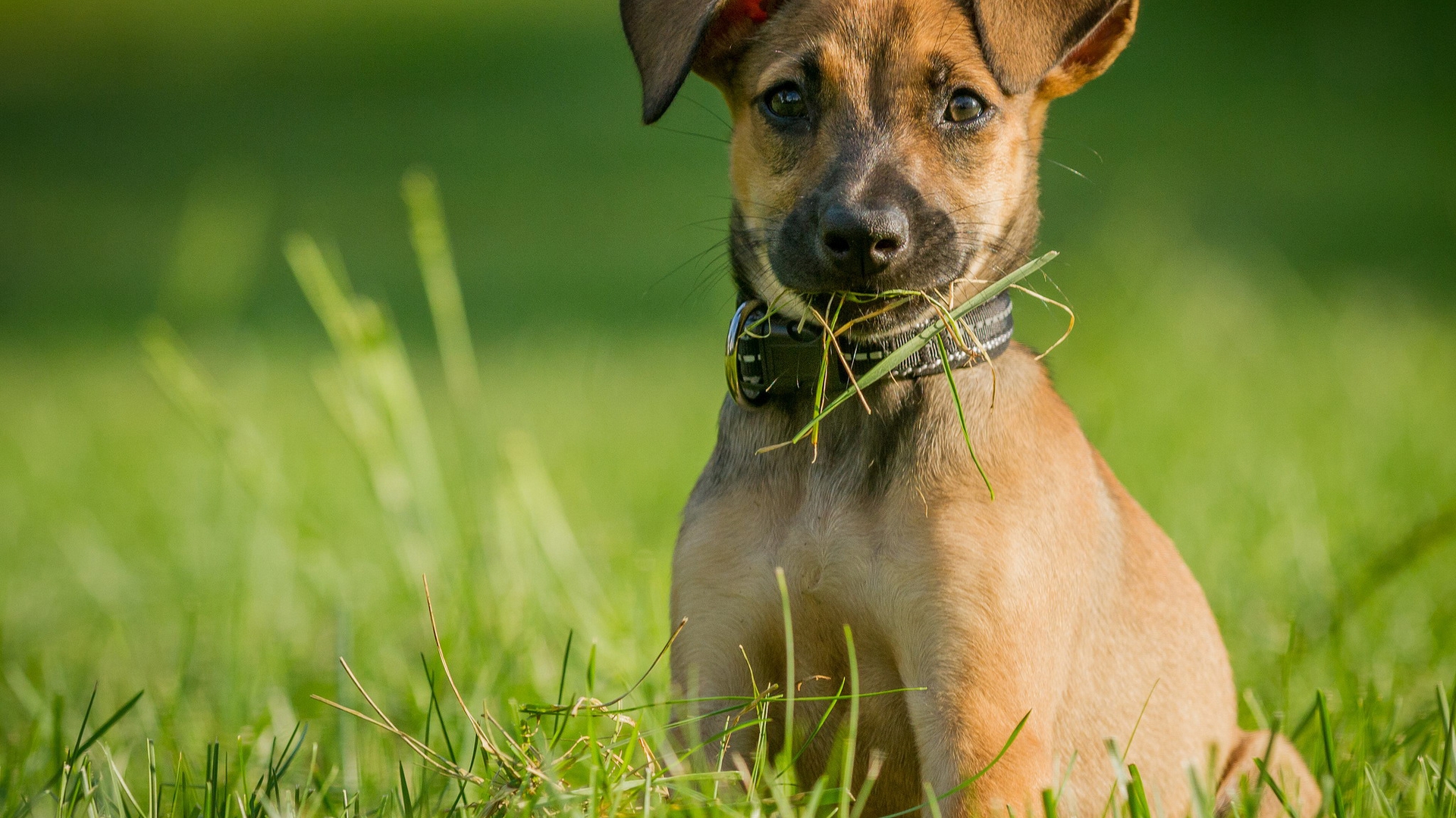 Description: A dog is sitting in the grass and eating a stick of grass in its mouth.