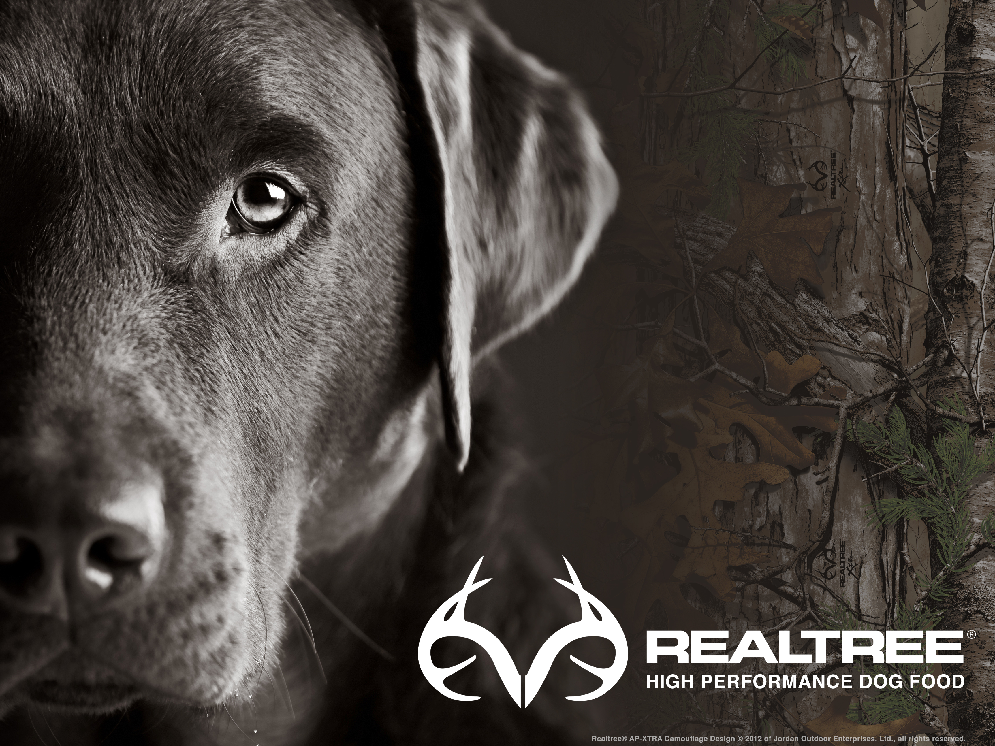 Description: A dog with a hunting theme on it's face and a hunting logo on the back of it.
