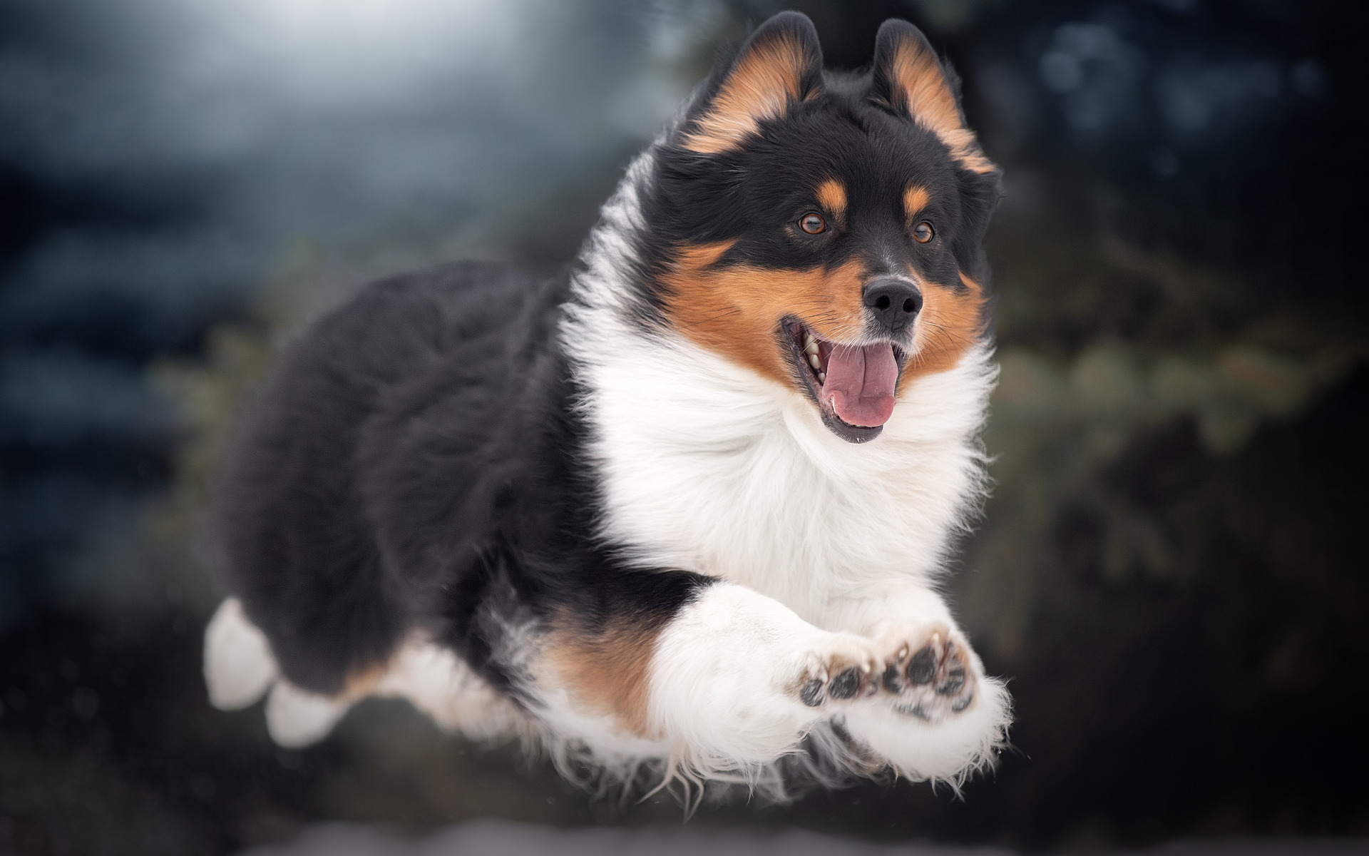 Description: A dog jumping in the air with its mouth open and tongue out.